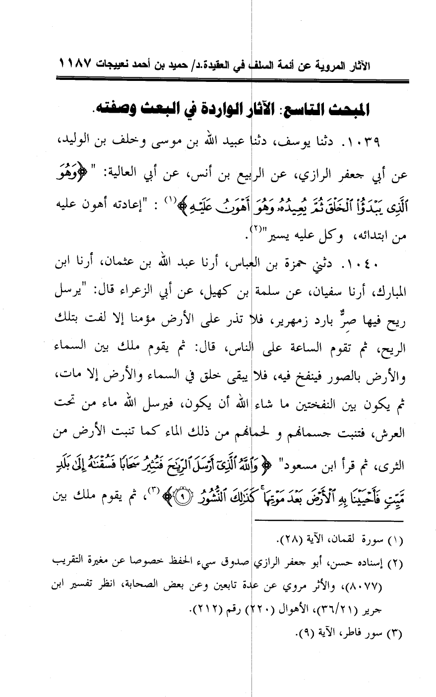 ١٠٣٩ - دثنا يوسف، دثنا عبيد اللَّه بن موسى وخلف بن الوليد، عن أبي جعفر الرازي، عن الربيع بن أنس، عن أبي العالية: {وَهُوَ الَّذِي يَبْدَأُ الْخَلْقَ ثُمَّ يُعِيدُهُ وَهُوَ أَهْوَنُ عَلَيْهِ} (¬١): "إعادته أهون عليه من ابتدائه، وكل عليه يسير" (¬٢).