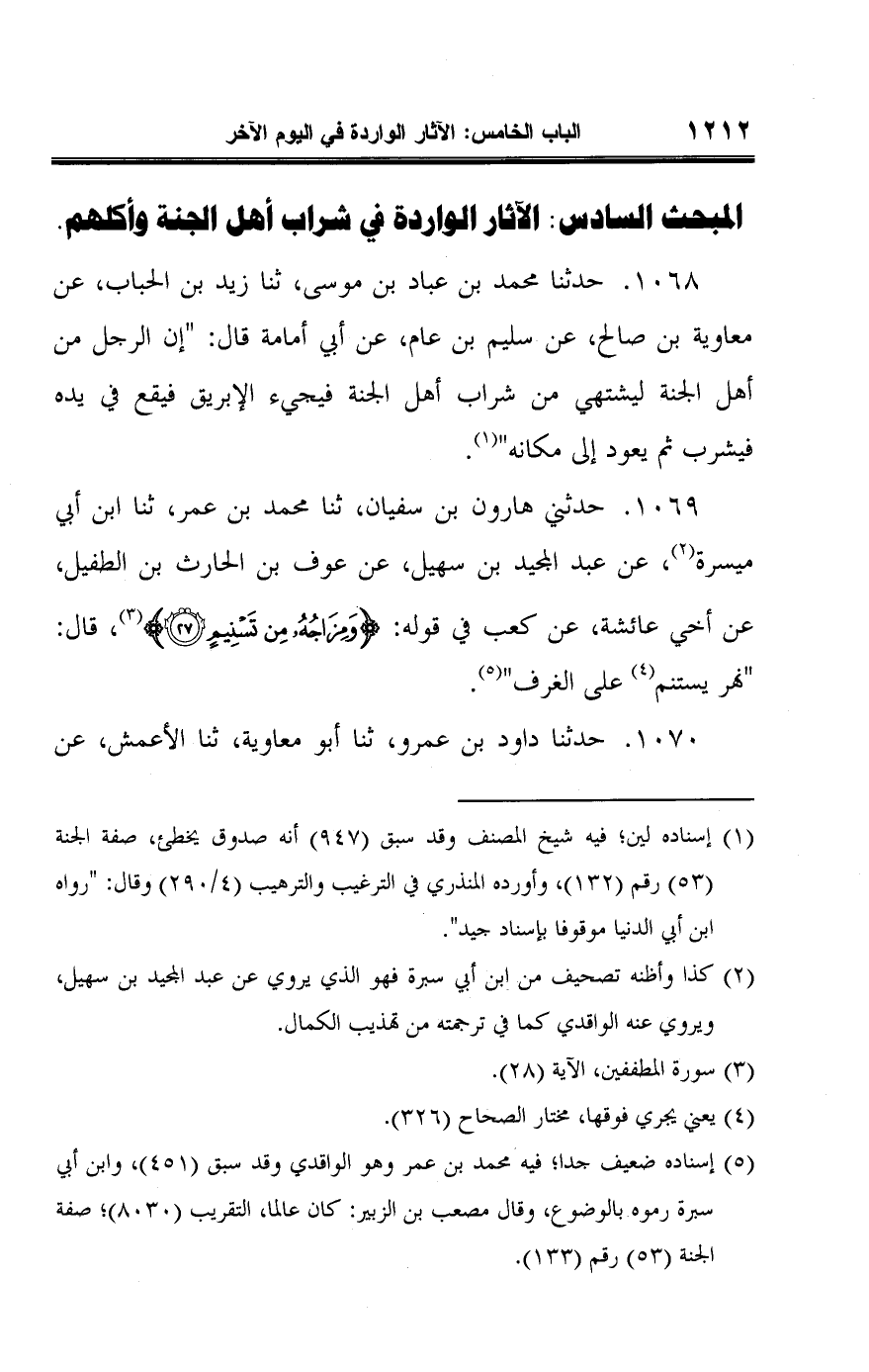 ١٠٦٨ - حدثنا محمد بن عباد بن موسى، ثنا زيد بن الحباب، عن معاوية بن صالح، عن سليم بن عام، عن أبي أمامة قال: "إن الرجل من أهل الجنة ليشتهي من شراب أهل الجنة فيجيء الإبريق فيقع في يده فيشرب ثم يعود إلى مكانه" (¬١).
