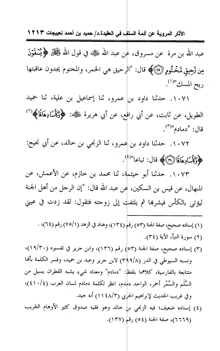 ١٠٧١ - حدثنا داود بن عمرو، ثنا إسماعيل بن علية، ثنا حميد الطويل، عن ثابت، عن أبي رافع، عن أبي هريرة -رضي اللَّه عنه-: {وَكَأْسًا دِهَاقًا} (¬٢) قال: "دمادم" (¬٣).