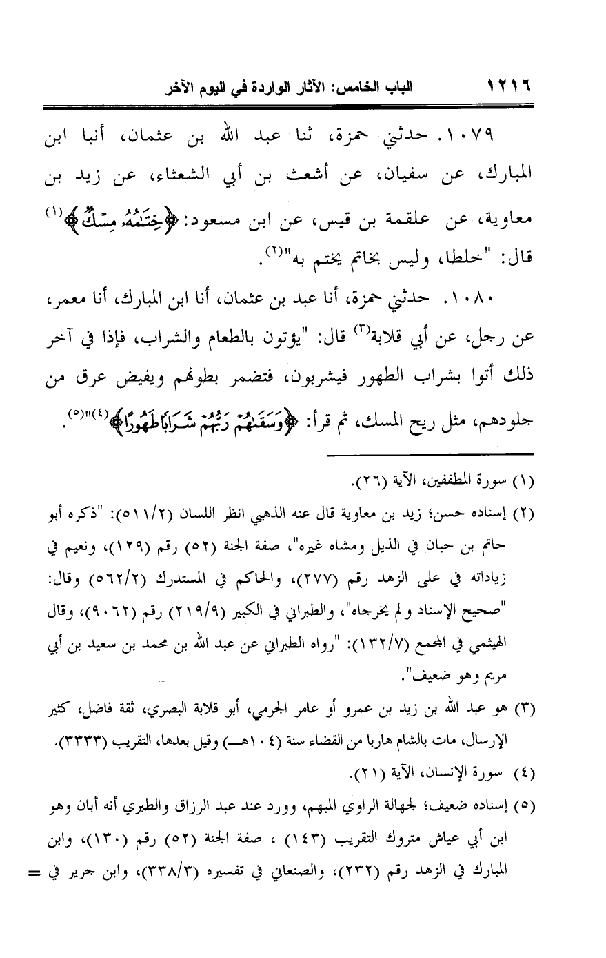 ١٠٨٠ - حدثني حمزة، أنا عبد بن عثمان، أنا ابن المبارك، أنا معمر، عن رجل، عن أبي قلابة (¬٣) قال: "يؤتون بالطعام والشراب، فإذا في آخر ذلك أتوا بشراب الطهور فيشربون، فتضمر بطونهم ويفيض عرق من جلودهم، مثل ريح المسك، ثم قرأ: {وَسَقَاهُمْ رَبُّهُمْ شَرَابًا طَهُورًا} (¬٤) " (¬٥).