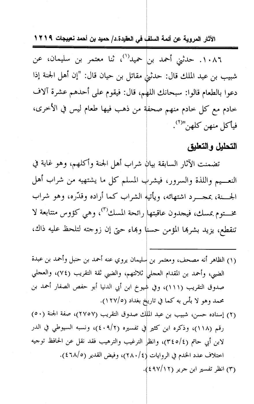 ١٠٨٦ - حدثني أحمد بن حميد (¬١)، ثنا معتمر بن سليمان، عن شبيب بن عبد الملك قال: حدثني مقاتل بن حيان قال: "إن أهل الجنة إذا دعوا بالطعام قالوا: سبحانك اللهم، قال: فيقوم على أحدهم عشرة آلاف خادم مع كل خادم منهم صحفة من ذهب فيها طعام ليس في الأخرى، فيأكل منهن كلهن" (¬٢).