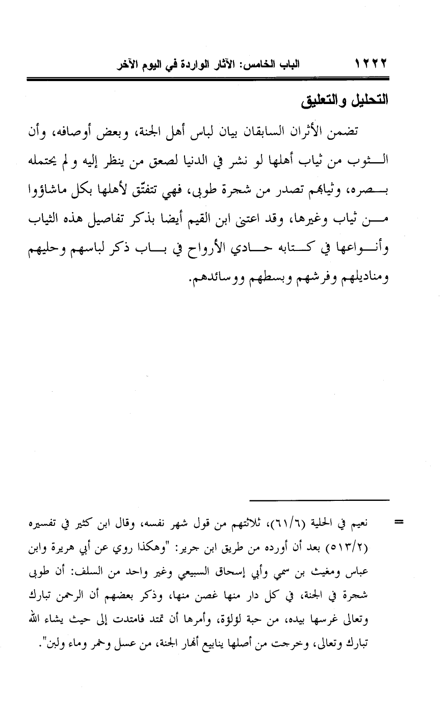 تضمن الأثران السابقان بيان لباس أهل الجنة، وبعض أوصافه، وأن الثوب من ثياب أهلها لو نشر في الدنيا لصعق من ينظر إليه ولم يحتمله بصره، وثيابهم تصدر من شجرة طوبى، فهى تتفتّق لأهلها بكل ما شاؤوا من ثياب وغيرها، وقد اعتني ابن القيم أيضا بذكر تفاصيل هذه الثياب وأنواعها في كتابه حادي الأرواح في باب ذكر لباسهم وحليهم ومناديلهم وفرشهم وبسطهم ووسائدهم.