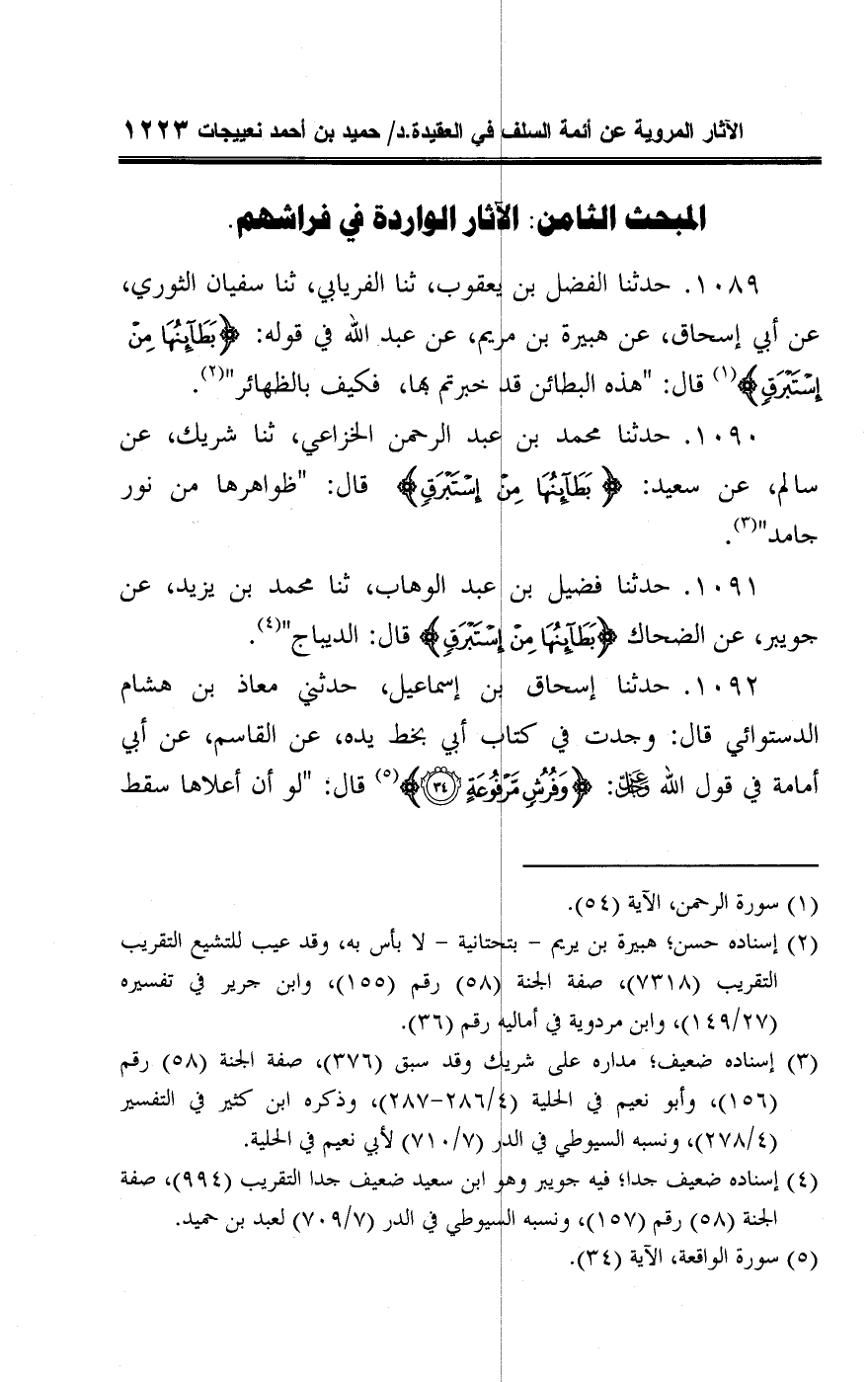 ١٠٩٠ - حدثنا محمد بن عبد الرحمن الخزاعي، ثنا شريك، عن سالم، عن سعيد: {بَطَائِنُهَا مِنْ إِسْتَبْرَقٍ} قال: "ظواهرها من نور جامد" (¬٣).