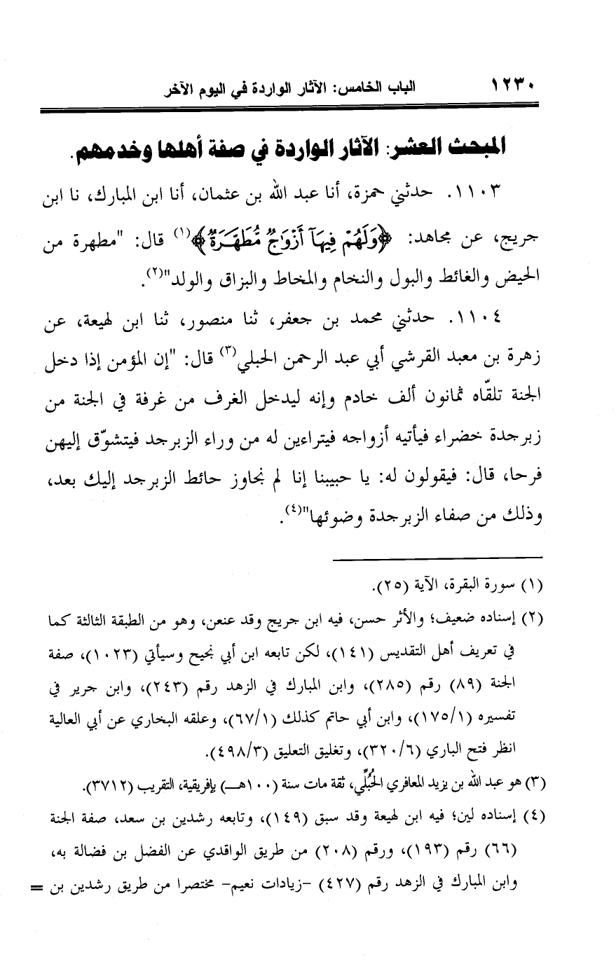 ١١٠٣ - حدثني حمزة، أنا عبد اللَّه بن عثمان، أنا ابن المبارك، نا ابن جريج، عن مجاهد: {وَلَهُمْ فِيهَا أَزْوَاجٌ مُطَهَّرَةٌ} (¬١) قال: "مطهرة من الحيض والغائط والبول والنخام والمخاط والبزاق والولد" (¬٢).