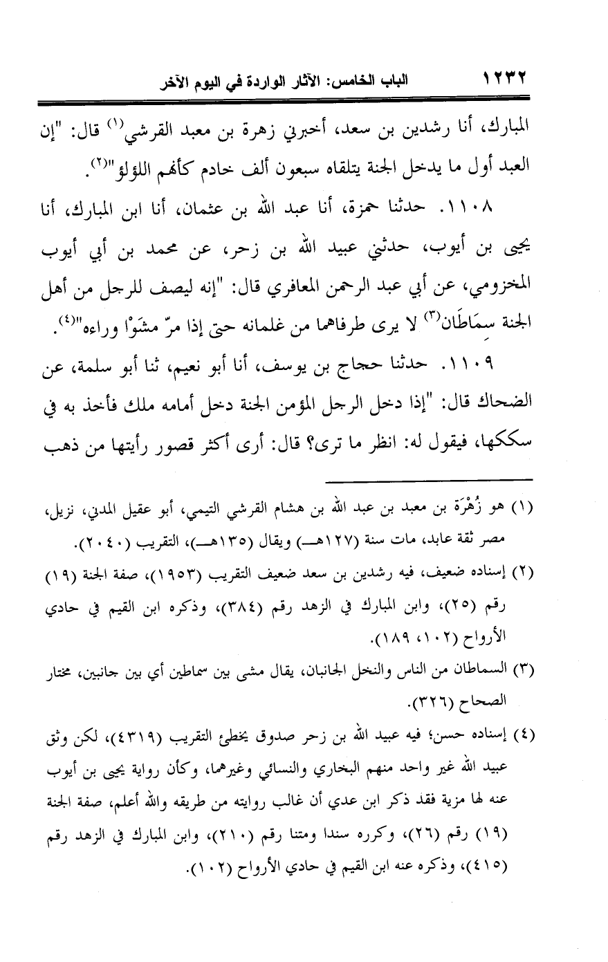 ١١٠٨ - حدثنا حمزة، أنا عبد اللَّه بن عثمان، أنا ابن المبارك، أنا يحيى بن أيوب، حدثني عبيد اللَّه بن زحر، عن محمد بن أبي أيوب المخزومي، عن أبي عبد الرحمن المعافري قال: "إنه ليصف للرجل من أهل الجنة سِمَاطَان (¬٣) لا يرى طرفاهما من غلمانه حتى إذا مرّ مشَوْا وراءه، " (¬٤).