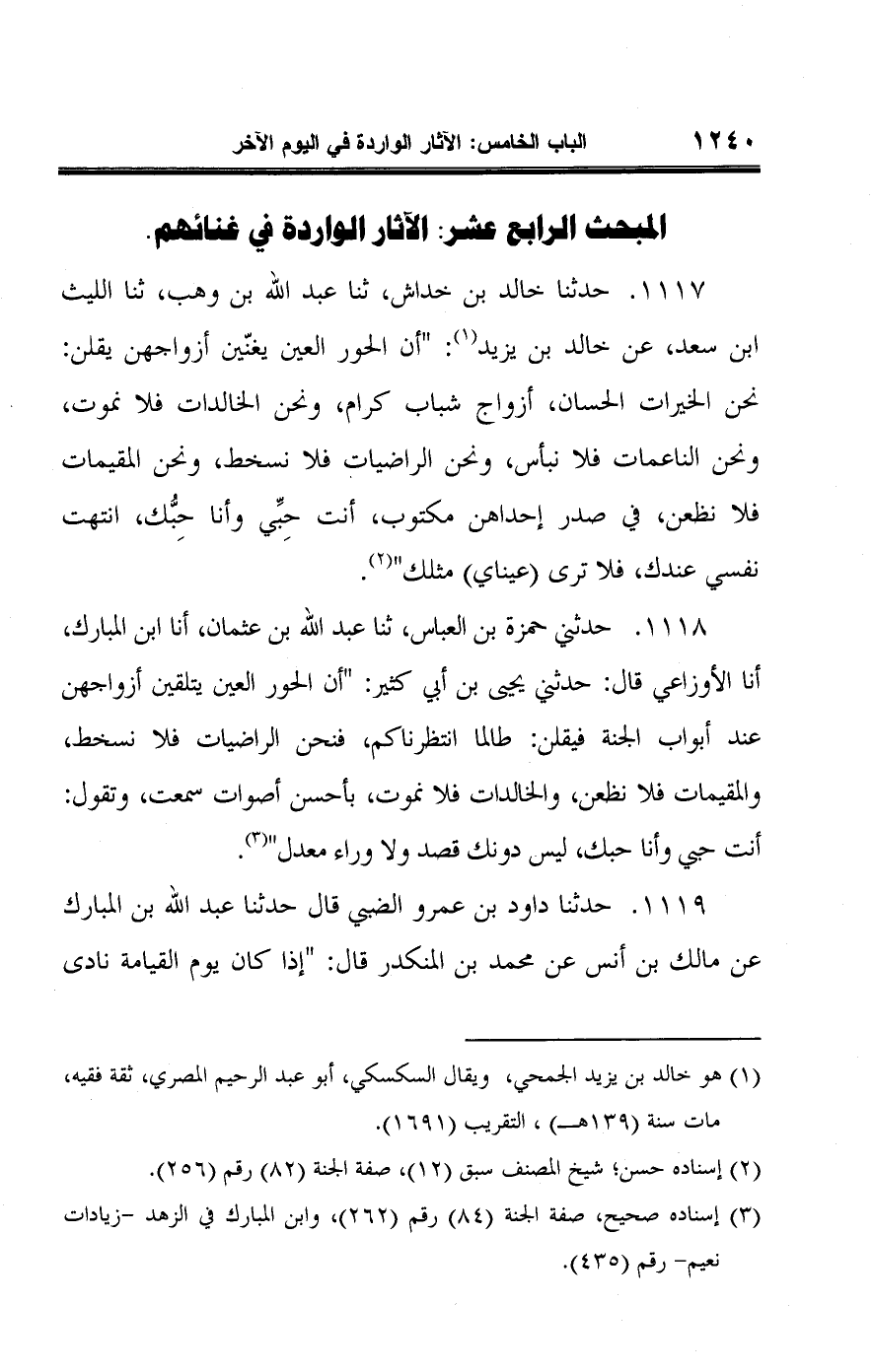 ١١١٧ - حدثنا خالد بن خداش، ثنا عبد اللَّه بن وهب، ثنا الليث ابن سعد، عن خالد بن يزيد (¬١): "أن الحور العين يغنّين أزواجهن يقلن: نحن الخيرات الحسان، أزواج شباب كرام، ونحن الخالدات فلا نموت، ونحن الناعمات فلا نبأس، ونحن الراضيات فلا نسخط، ونحن المقيمات فلا نظعن، في صدر إحداهن مكتوب، أنت حِبِّي وأنا حِبُّك، انتهت نفسي عندك، فلا ترى (عيناي) مثلك" (¬٢).