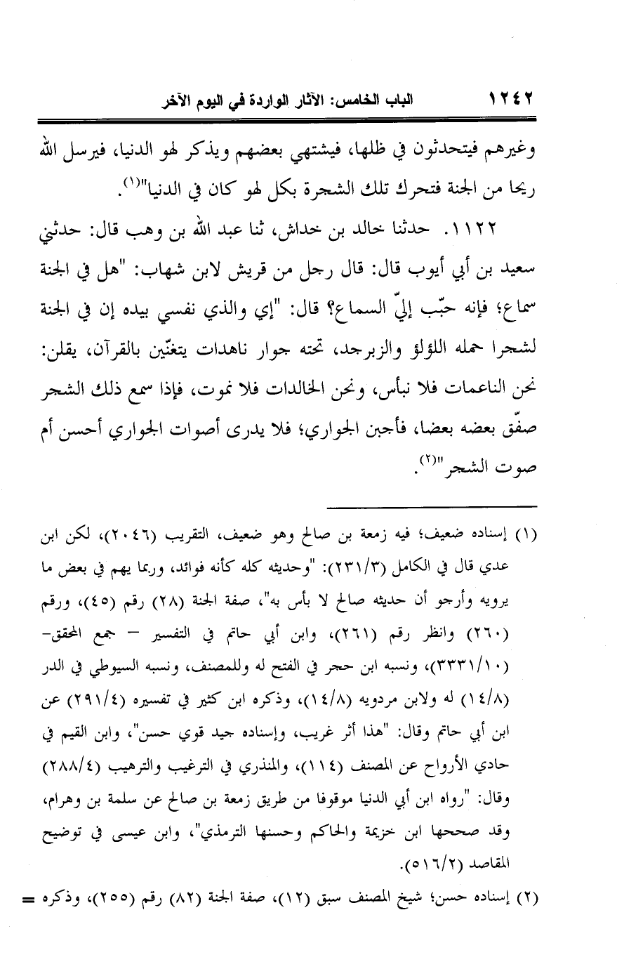 ١١٢٢ - حدثنا خالد بن خداش، ثنا عبد اللَّه بن وهب قال: حدثني سعيد بن أبي أيوب قال: قال رجل من قريش لابن شهاب: "هل في الجنة سماع؛ فإنه حبّب إليّ السماع؟ قال: "إي والذي نفسي بيده إن في الجنة لشجرا حمله اللؤلؤ والزبرجد، تحته جوار ناهدات يتغنّين بالقرآن، يقلن: نحن الناعمات فلا نبأس، ونحن الخالدات فلا نموت، فإذا سمع ذلك الشجر صفّق بعضه بعضا، فأجبن الجواري؛ فلا يدرى أصوات الجواري أحسن أم صوت الشجر" (¬٢).