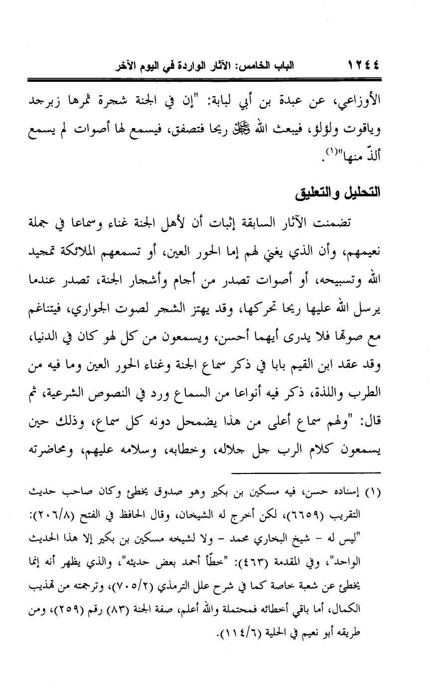 (¬١) إسناده حسن، فيه مسكين بن بكير وهو صدوق يخطئ وكان صاحب حديث التقريب (٦٦٥٩)، لكن أخرج له الشيخان، وقال الحافظ في الفتح (٨/ ٢٠٦): "ليس له -شيخ البخاري محمد- ولا لشيخه مسكين بن بكير إلا هذا الحديث الواحد"، وفي المقدمة (٤٦٣): "خطّأ أحمد بعض حديثه"، والذي يظهر أنه إنما يخطئ عن شعبة خاصة كما في شرح علل الترمذي (٢/ ٧٠٥)، وترجمته من تهذيب الكمال، أما باقي أخطائه فمحتملة واللَّه أعلم، صفة الجنة (٨٣) رقم (٢٥٩)، ومن طريقه أبو نعيم في الحلية (٦/ ١١٤).