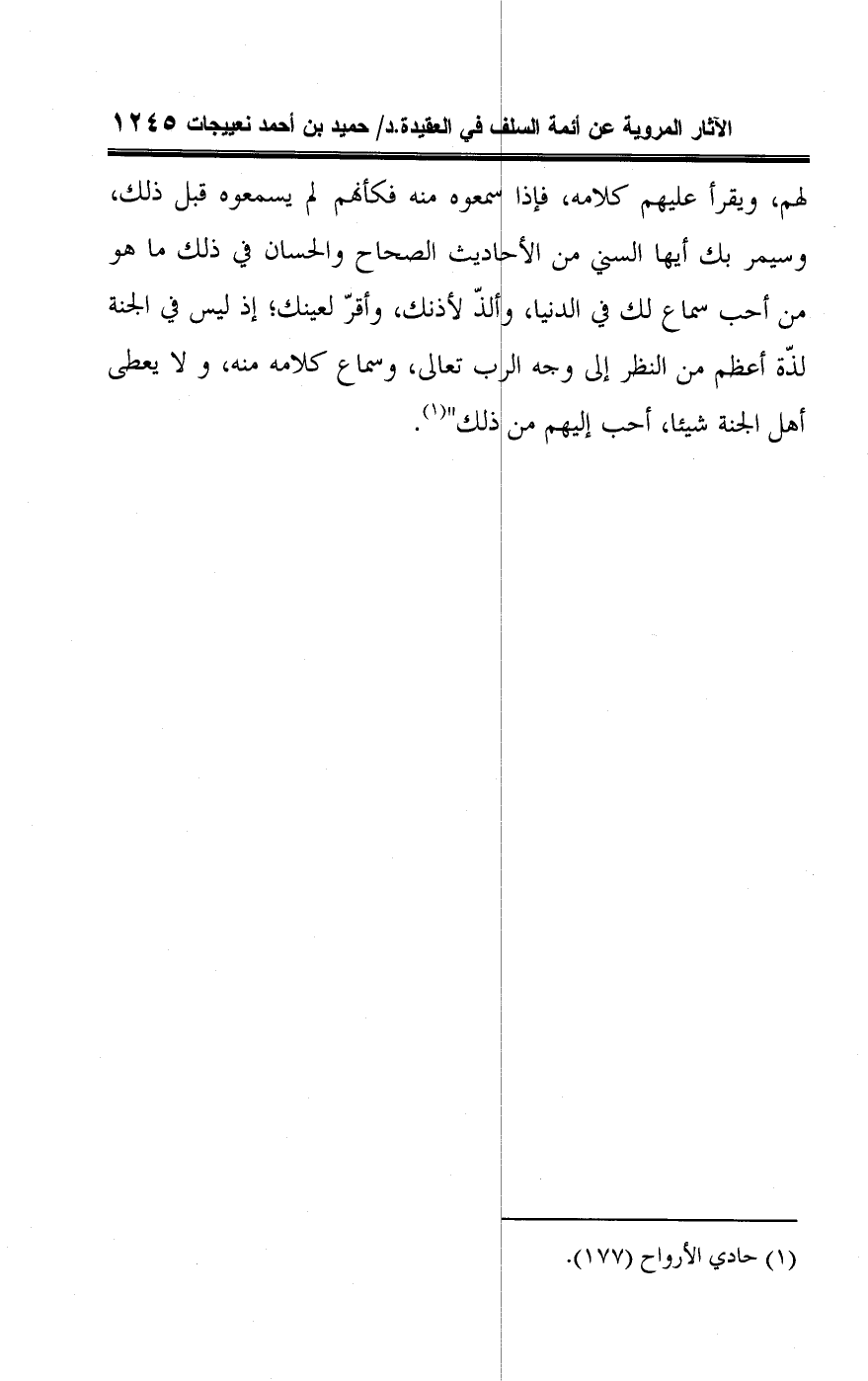 لهم، ويقرأ عليهم كلامه، فإذا سمعوه منه فكأنهم لم يسمعوه قبل ذلك، وسيمر بك أيها السني من الأحاديث الصحاح والحسان في ذلك ما هو من أحب سماع لك في الدنيا، وألذّ لأذنك، وأقرّ لعينك؛ إذ ليس في الجنة لذّة أعظم من النظر إلى وجه الرب تعالى، وسماع كلامه منه، ولا يعطى أهل الجنة شيئا، أحب إليهم من ذلك" (¬١).