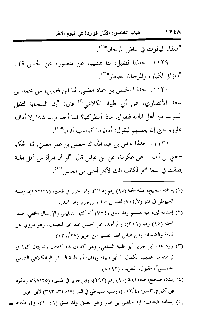 (¬٤) إسناده صحيح، صفة الجنة (٩٠) رقم (٢٩٢)، وابن جرير في تفسيره (٢٥/ ٩٧)، وذكره ابن كثير في تفسيره (٤/ ١١٢)، ونسبه السيوطي في الدر (٧/ ٣٤٥، ٣٩٣) لابن جرير.