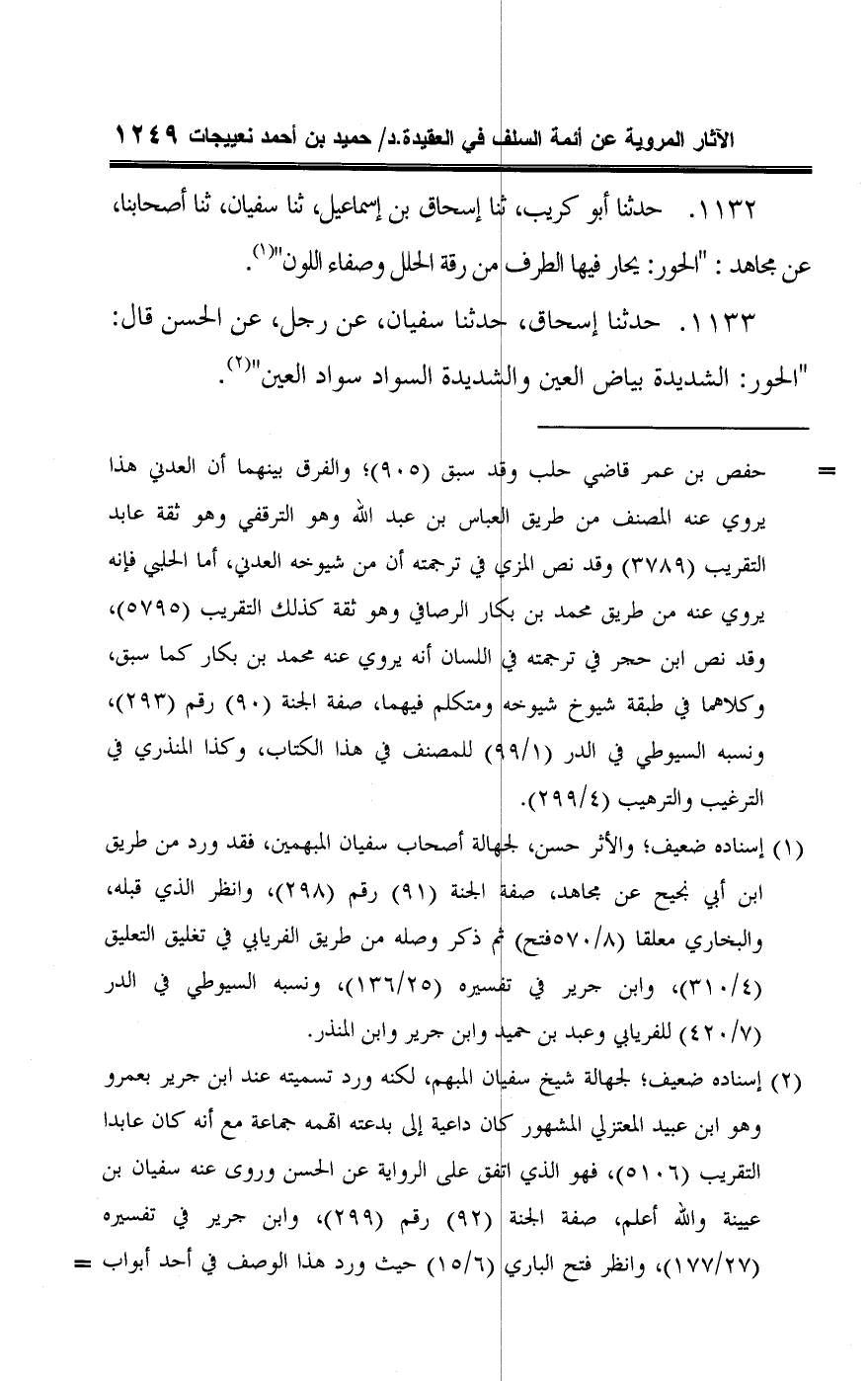 ١١٣٣ - حدثنا إسحاق، حدثنا سفيان، عن رجل، عن الحسن قال: "الحور: الشديدة بياض العين والشديدة السواد سواد العين" (¬٢).