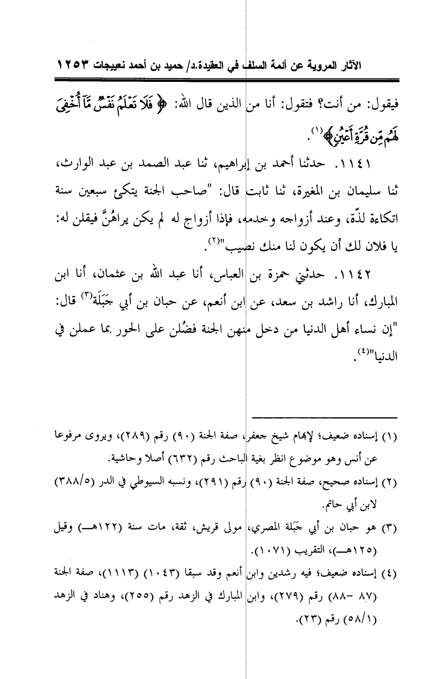 ١١٤٢ - حدثني حمزة بن العباس، أنا عبد اللَّه بن عثمان، أنا ابن المبارك، أنا راشد بن سعد، عن ابن أنعم، عن حبان بن أبي جَبَلَة (¬٣) قال: "إن نساء أهل الدنيا من دخل منهن الجنة فضُلن على الحور بما عملن في الدنيا" (¬٤).