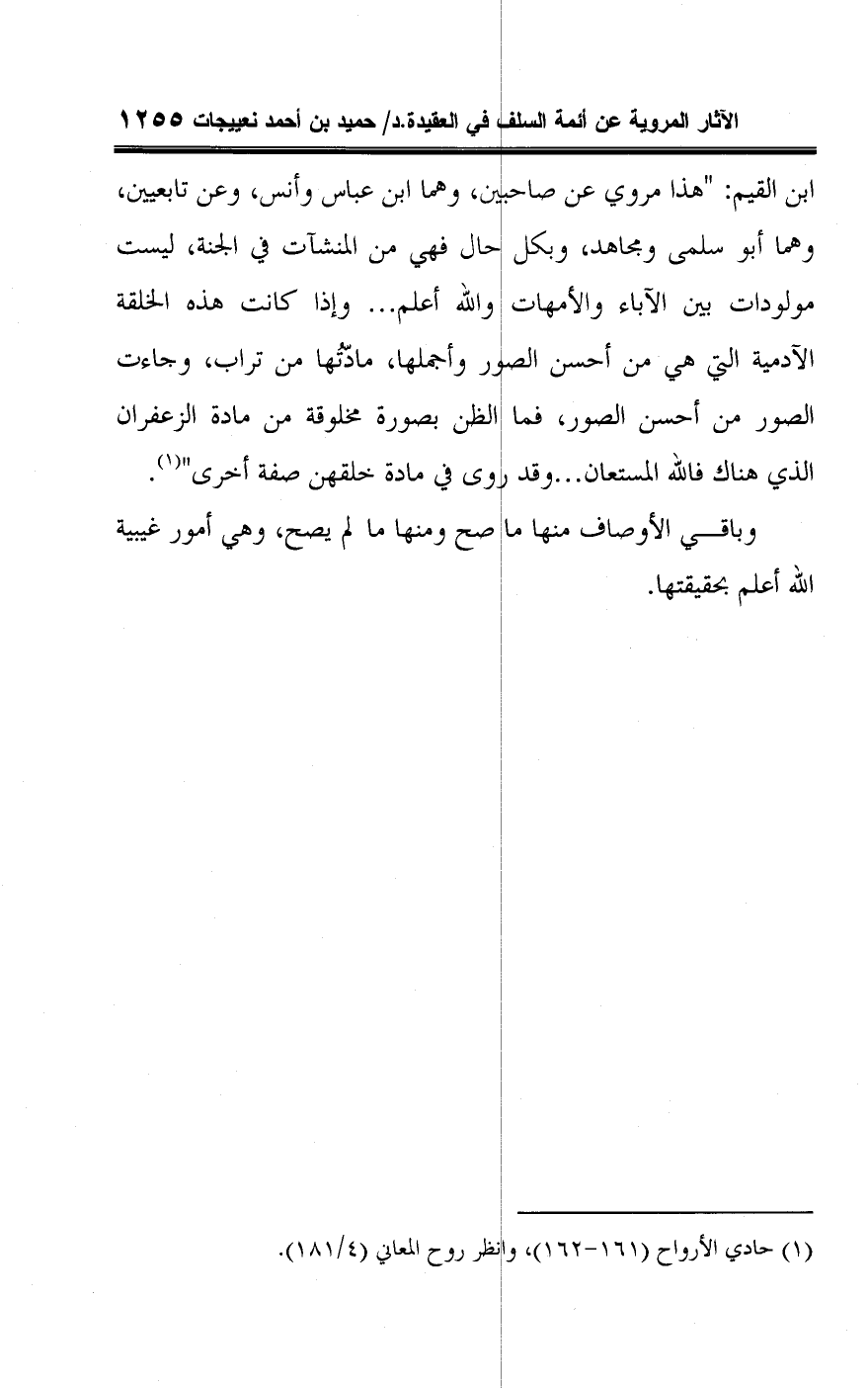 ابن القيم: "هذا مروي عن صاحبين، وهما ابن عباس وأنس، وعن تابعيين، وهما أبو سلمى ومجاهد، وبكل حال فهي من المنشآت في الجنة، ليست مولودات بين الآباء والأمهات واللَّه أعلم. . . وإذا كانت هذه الخلقة الآدمية التي هي من أحسن الصور وأجملها، مادّتُها من تراب، وجاءت الصور من أحسن الصور، فما الظن بصورة مخلوقة من مادة الزعفران الذي هناك فاللَّه المستعان. . . وقد روى في مادة خلقهن صفة أخرى" (¬١).