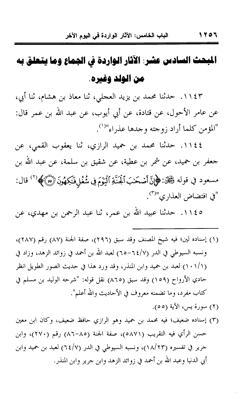 ١١٤٤ - حدثنا محمد بن حميد الرازي، ثنا يعقوب القمي، عن جعفر بن حميد، عن شمر بن عطية، عن شقيق بن سلمة، عن عبد اللَّه بن مسعود في قوله -عَزَّ وَجَلَّ-: {إِنَّ أَصْحَابَ الْجَنَّةِ الْيَوْمَ فِي شُغُلٍ فَاكِهُونَ (٥٥)} (¬٢) قال: "في افتضاض العذاري" (¬٣).