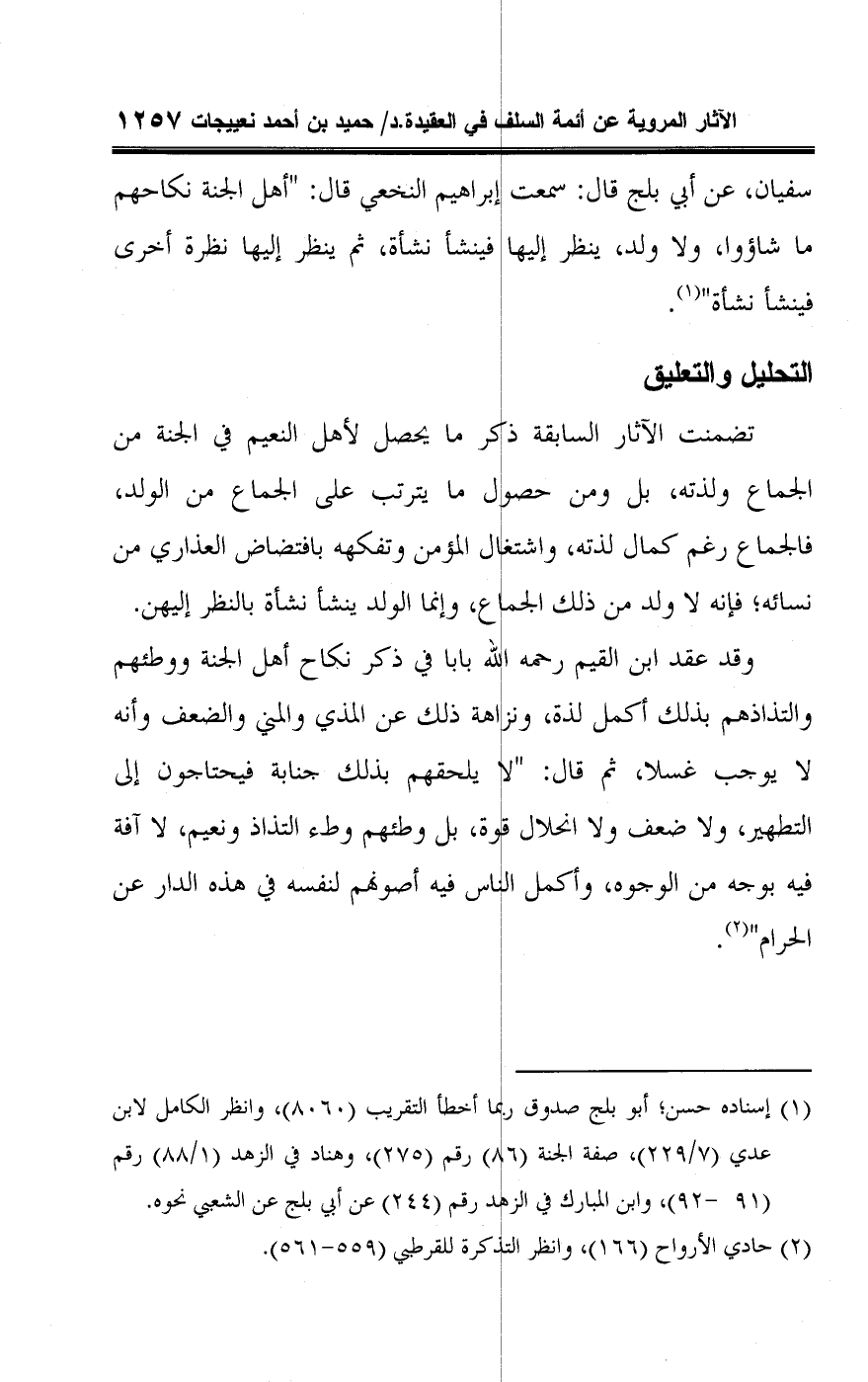 وقد عقد ابن القيم رحمه اللَّه بابا في ذكر نكاح أهل الجنة ووطئهم والتذاذهم بذلك أكمل لذة، ونزاهة ذلك عن المذي والمني والضعف وأنه لا يوجب غسلا، ثم قال: "لا يلحقهم بذلك جنابة فيحتاجون إلى التطهير، ولا ضعف ولا انحلال قوة، بل وطئهم وطء التذاذ ونعيم، لا آفة فيه بوجه من الوجوه، وأكمل الناس فيه أصونهم لنفسه في هذه الدار عن الحرام" (¬٢).