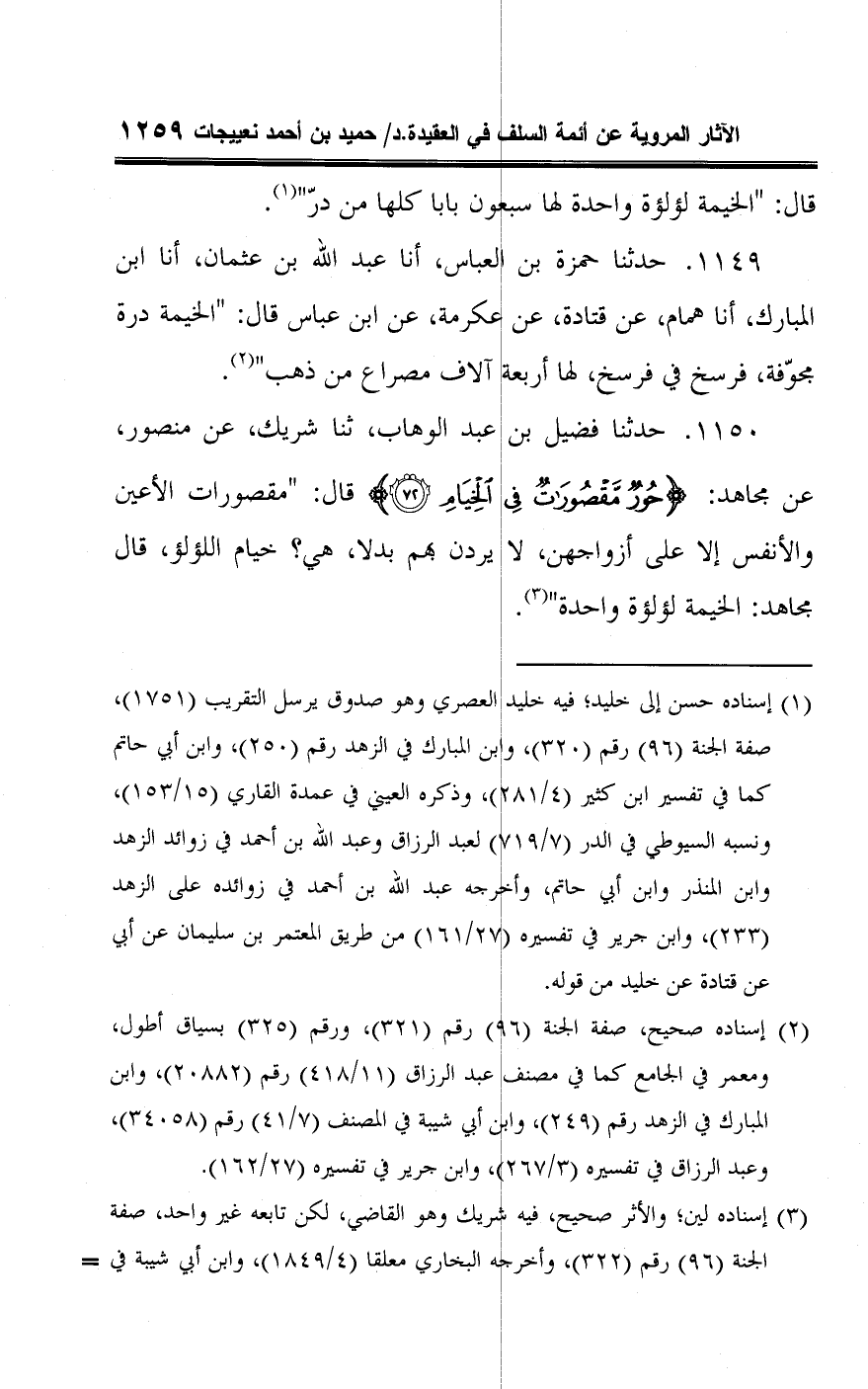 ١١٤٩ - حدثنا حمزة بن العباس، أنا عبد اللَّه بن عثمان، أنا ابن المبارك، أنا همام، عن قتادة، عن عكرمة، عن ابن عباس قال: "الخيمة درة مجوّفة، فرسخ في فرسخ، لها أربعة آلاف مصراع من ذهب" (¬٢).