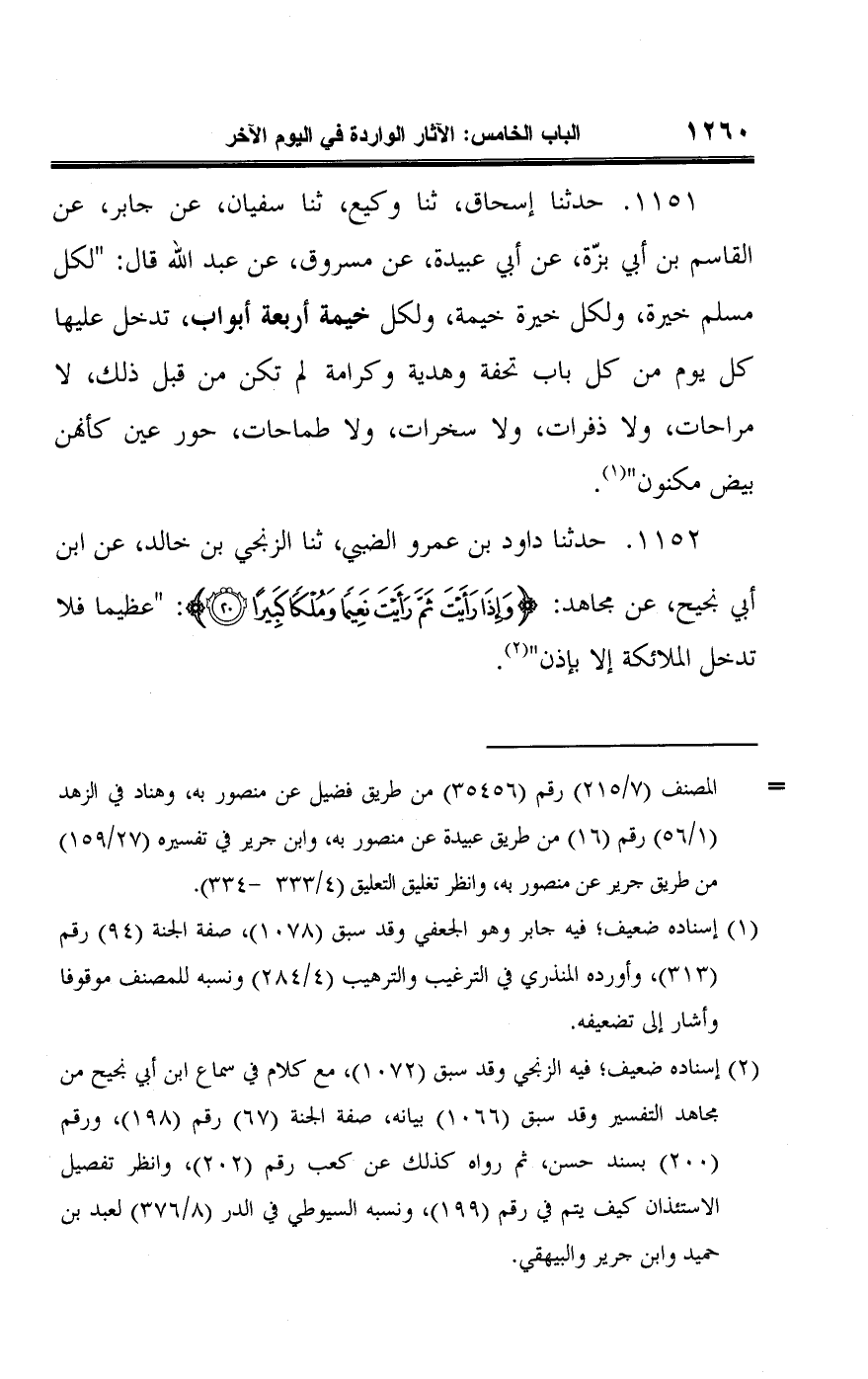 ١١٥١ - حدثنا إسحاق، ثنا وكيع، ثنا سفيان، عن جابر، عن القاسم بن أبي بزّة، عن أبي عبيدة، عن مسروق، عن عبد اللَّه قال: "لكل مسلم خيرة، ولكل خيرة خيمة، ولكل خيمة أربعة أبواب، تدخل عليها كل يوم من كل باب تحفة وهدية وكرامة لم تكن من قبل ذلك، لا مراحات، ولا ذفرات، ولا سخرات، ولا طماحات، حور عين كأنهن بيض مكنون" (¬١).