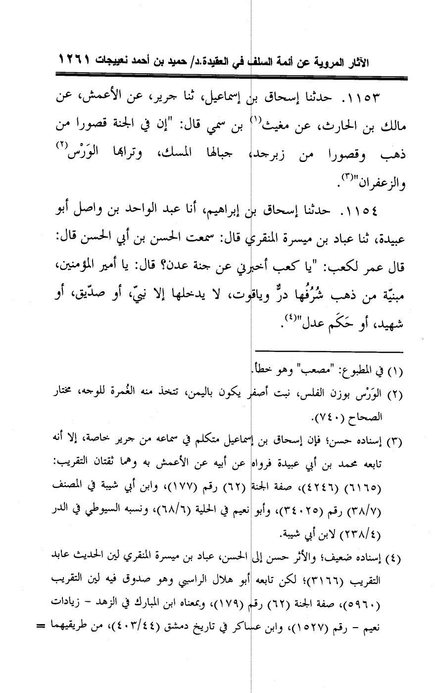 ١١٥٣ - حدثنا إسحاق بن إسماعيل، ثنا جرير، عن الأعمش، عن مالك بن الحارث، عن مغيث (¬١) بن سمي قال: "إن في الجنة قصورا من ذهب وقصورا من زبرجد، جبالها المسك، وترابها الوَرْس (¬٢) والزعفران" (¬٣).