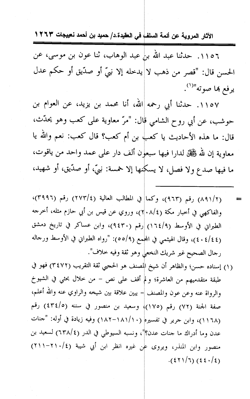 ١١٥٧ - حدثنا أبي رحمه اللَّه، أنا محمد بن يزيد، عن العوام بن حوشب، عن أبي روح الشامي قال: "مرّ معاوية على كعب وهو يحدّث، قال: ما هذه الأحاديث يا كعب بن أم كعب؟ قال كعب: نعم واللَّه يا معاوية إن للَّه -عَزَّ وَجَلَّ- لدارا فيها سبعون ألف دار على عمد واحد من ياقوت، ما فيها صدع ولا فصل، لا يسكنها إلا خمسة: نبيّ، أو صدّيق، أو شهيد،