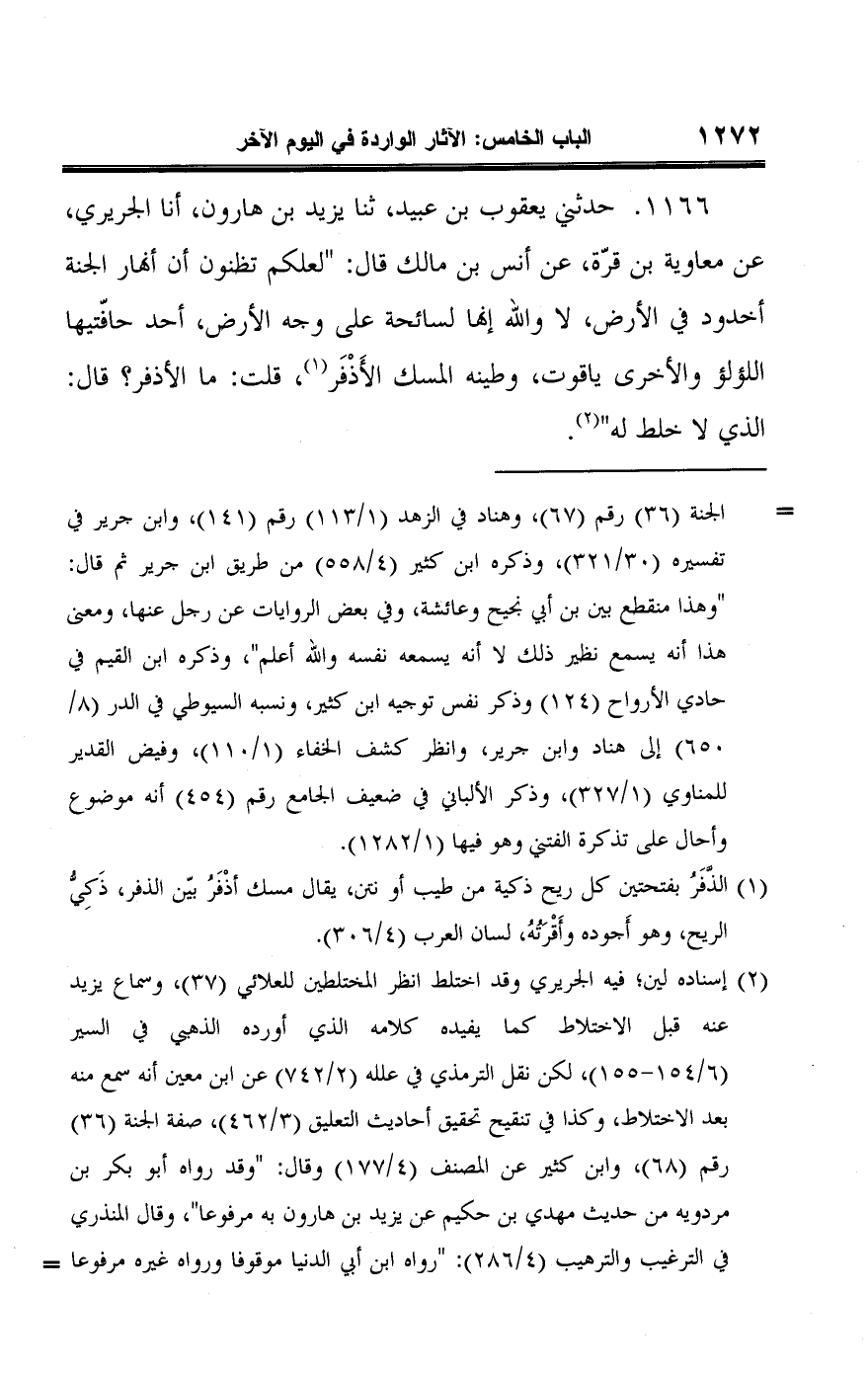 ١١٦٦ - حدثني يعقوب بن عبيد، ثنا يزيد بن هارون، أنا الجريري، عن معاوية بن قرّة، عن أنس بن مالك قال: "لعلكم تظنون أن أنهار الجنة أخدود في الأرض، لا واللَّه إنها لسائحة على وجه الأرض، أحد حافّتيها اللؤلؤ والأخرى ياقوت، وطينه المسك الأَذْفَر (¬١)، قلت: ما الأذفر؟ قال: الذي لا خلط له" (¬٢).