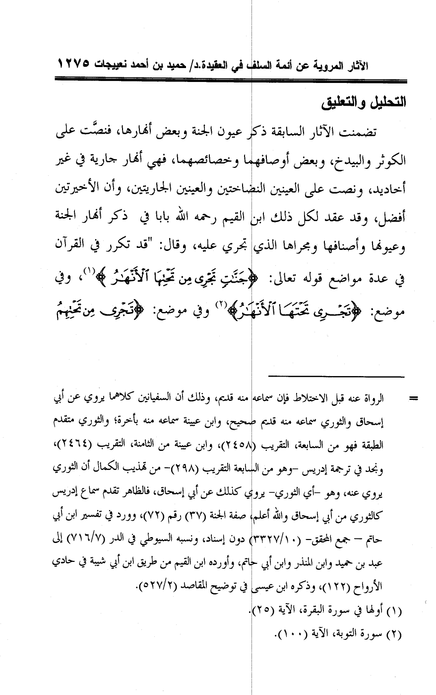 = الرواة عنه قبل الاختلاط فإن سماعه منه قدم، وذلك أن السفيانين كلاهما يروي عن أبي إسحاق والثوري سماعه منه قديم صحيح، وابن عيينه سماعه منه بأخرة؛ والثوري متقدم الطبقة فهو من السابعة، التقريب (٢٤٥٨)، وابن عيينة من الثامنة، التقريب (٢٤٦٤)، ونجد في ترجمة إدريس -وهو من السابعة التقريب (٢٩٨) - من تهذيب الكمال أن الثوري يروي عنه، وهو -أي الثوري- يروي كذلك عن أبي إسحاق، فالظاهر تقدم سماع إدريس كالثوري من أبي إسحاق واللَّه أعلم! صفة الجنة (٣٧) رقم (٧٢)، وورد في تفسير ابن أبي حاتم -جمع المحقق- (١٠/ ٣٣٢٧) دون إسناد، ونسبه السيوطي في الدر (٧/ ٧١٦) إلى عبد بن حميد وابن المنذر وابن أبي حاتم، وأورده ابن القيم من طريق ابن أبي شيبة في حادي الأرواح (١٢٢)، وذكره ابن عيسى في توضيح المقاصد (٢/ ٥٢٧).