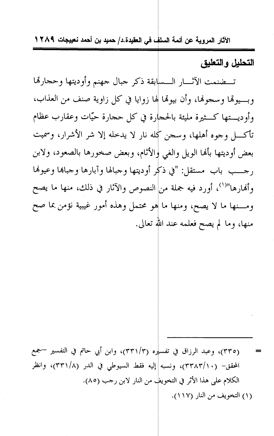 تضنمت الآثار السابقة ذكر جبال جهنم وأوديتها وحجارتها وبيوتها وسجونها، وأن بيوتها لها زوايا في كل زاوية صنف من العذاب، وأوديتها كثيرة مليئة بالحجارة في كل حجارة حيّات وعقارب عظام تأكل وجوه أهلها، وسجن كله نار لا يدخله إلا شر الأشرار، وسميت بعض أوديتها بأنها الويل والغي والأثام، وبعض صخورها بالصعود، ولابن رجب باب مستقل: "في ذكر أوديتها وجبالها وآبارها وجبابها وعيونها وأنهارها" (¬١)، أورد فيه جملة من النصوص والآثار في ذلك، منها ما يصح ومنها ما لا يصح، ومنها ما هو محتمل وهذه أمور غيبية نؤمن بما صح منها، وما لم يصح فعلمه عند اللَّه تعالى.