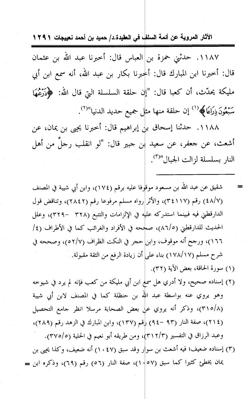 ١١٨٧ - حدثني حمزة بن العباس قال: أخبرنا عبد اللَّه بن عثمان قال: أخبرنا ابن المبارك قال: أخبرنا بكار بن عبد اللَّه، أنه سمع ابن أبي مليكة يحدّث، أن كعبا قال: "إن حلقة السلسلة التي قال اللَّه: {ذَرْعُهَا سَبْعُونَ ذِرَاعًا} (¬١) إن حلقة منها مثل جميع حديد الدنيا" (¬٢).