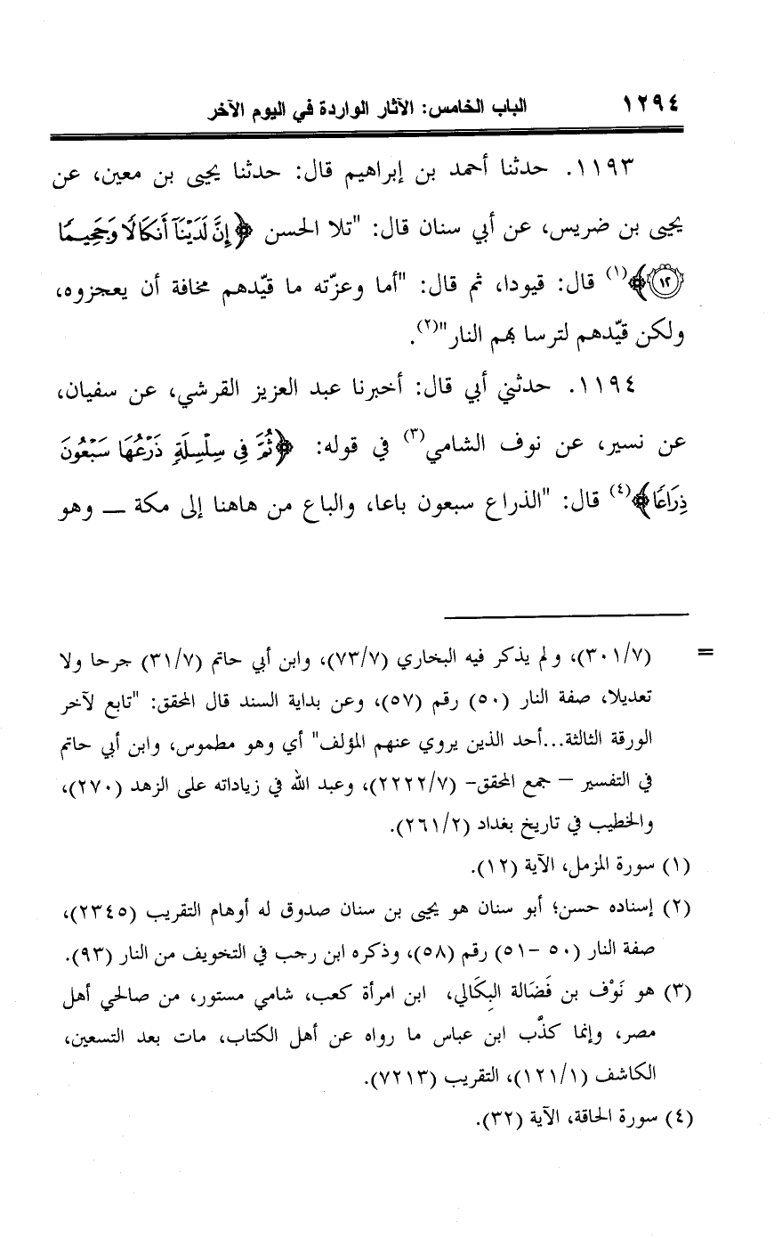 ١١٩٤ - حدثني أبي قال: أخبرنا عبد العزيز القرشي، عن سفيان، عن نسير، عن نوف الشامي (¬٣) في قوله: {ثُمَّ فِي سِلْسِلَةٍ ذَرْعُهَا سَبْعُونَ ذِرَاعًا} (¬٤) قال: "الذراع سبعون باعا، والباع من هاهنا إلى مكة -وهو