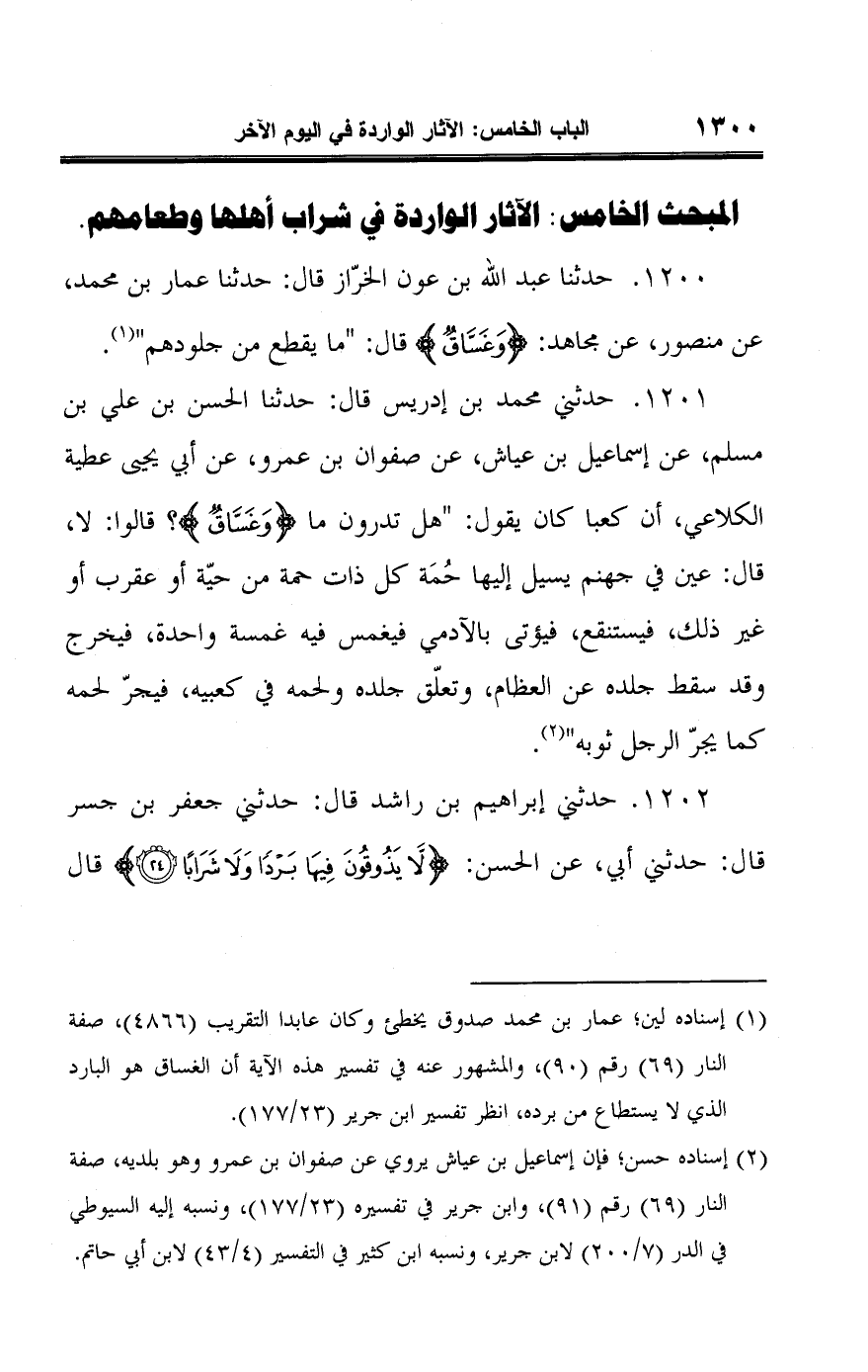 ١٢٠٠ - حدثنا عبد اللَّه بن عون الخرّاز قال: حدثنا عمار بن محمد، عن منصور، عن مجاهد: {وَغَسَّاقٌ} قال: "ما يقطع من جلودهم" (¬١).