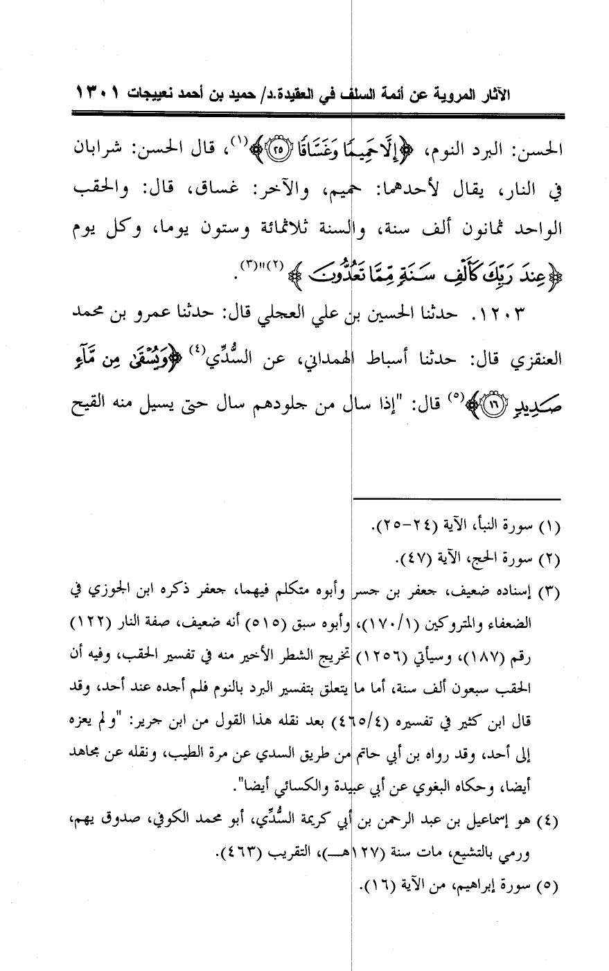 (¬٣) إسناده ضعيف، جعفر بن جسر وأبوه متكلم فيهما، جعفر ذكره ابن الجوزي في الضعفاء والمتروكين (١/ ١٧٠)، وأبوه سبق (٥١٥) أنه ضعيف، صفة النار (١٢٢) رقم (١٨٧)، وسيأتي (١٢٥٦) تخريج الشطر الأخير منه في تفسير الحقب، وفيه أن الحقب سبعون ألف سنة، أما ما يتعلق بتفسير البرد بالنوم فلم أجده عند أحد، وقد قال ابن كثير في تفسيره (٤/ ٤٦٥) بعد نقله هذا القول من ابن جرير: "ولم يعزه إلى أحد، وقد رواه بن أبي حاتم من طريق السدي عن مرة الطيب، ونقله عن مجاهد أيضًا، وحكاه البغوي عن أبي عبيدة والكسائي أيضًا".