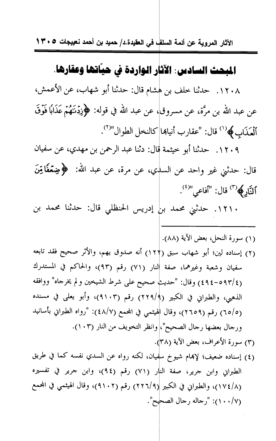 ١٢٠٨ - حدثنا خلف بن هشام قال: حدثنا أبو شهاب، عن الأعمش، عن عبد اللَّه بن مرَّة، عن مسروق، عن عبد اللَّه في قوله: {زِدْنَاهُمْ عَذَابًا فَوْقَ الْعَذَابِ} (¬١) قال: "عقارب أنيابها كالنخل الطوال" (¬٢).