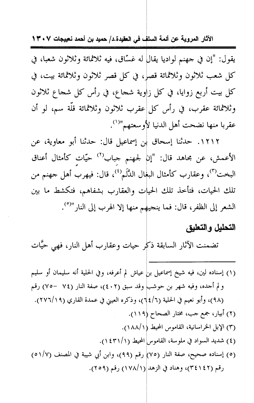 ١٢١٢ - حدثنا إسحاق بن إسماعيل قال: حدثنا أبو معاوية، عن الأعمش، عن مجاهد قال: "إن لجهنم جِباب (¬٢) حيّاتٍ كأمثال أعناق البخت (¬٣)، وعقارب كأمثال البغال الدَّلَم (¬٤)، قال: فيهرب أهل جهنم من تلك الحيات، فتأخذ تلك الحيات والعقارب بشفاهم، فتكشط ما بين الشعر إلى الظفر، قال: فما ينجيهم منها إلا الهرب إلى النار" (¬٥).