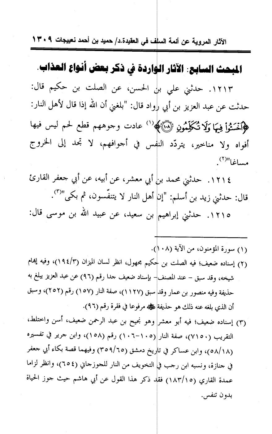 ١٢١٣ - حدثني علي بن الحسن، عن الصلت بن حكيم قال: حدثت عن عبد العزيز بن أبي رواد قال: "بلغني أن اللَّه إذا قال لأهل النار: {اخْسَئُوا فِيهَا وَلَا تُكَلِّمُونِ (١٠٨)} (¬١) عادت وجوههم قطع لحم ليس فيها أفواه ولا مناخير، يتردّد النفس في أجوافهم، لا تجد إلى الخروج مساغا" (¬٢).