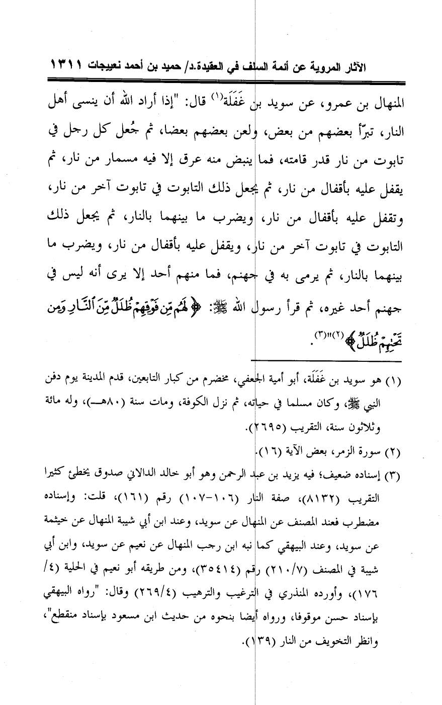 (¬٣) إسناده ضعيف؛ فيه يزيد بن عبد الرحمن وهو أبو خالد الدالاني صدوق يخطئ كثيرا التقريب (٨١٣٢)، صفة النار (١٠٦ - ١٠٧) رقم (١٦١)، قلت: وإسناده مضطرب فعند المصنف عن المنهال عن سويد، وعند ابن أبي شيبة المنهال عن خيثمة عن سويد، وعند البيهقي كما نبه ابن رجب المنهال عن نعيم عن سويد، وابن أبي شيبة في المصنف (٧/ ٢١٠) رقم (٣٥٤١٤)، ومن طريقه أبو نعيم في الحلية (٤/ ١٧٦)، وأورده المنذري في الترغيب والترهيب (٤/ ٢٦٩) وقال: "رواه البيهقي بإسناد حسن موقوفا، ورواه أيضا بنحوه من حديث ابن مسعود بإسناد منقطع"، وانظر التخويف من النار (١٣٩).