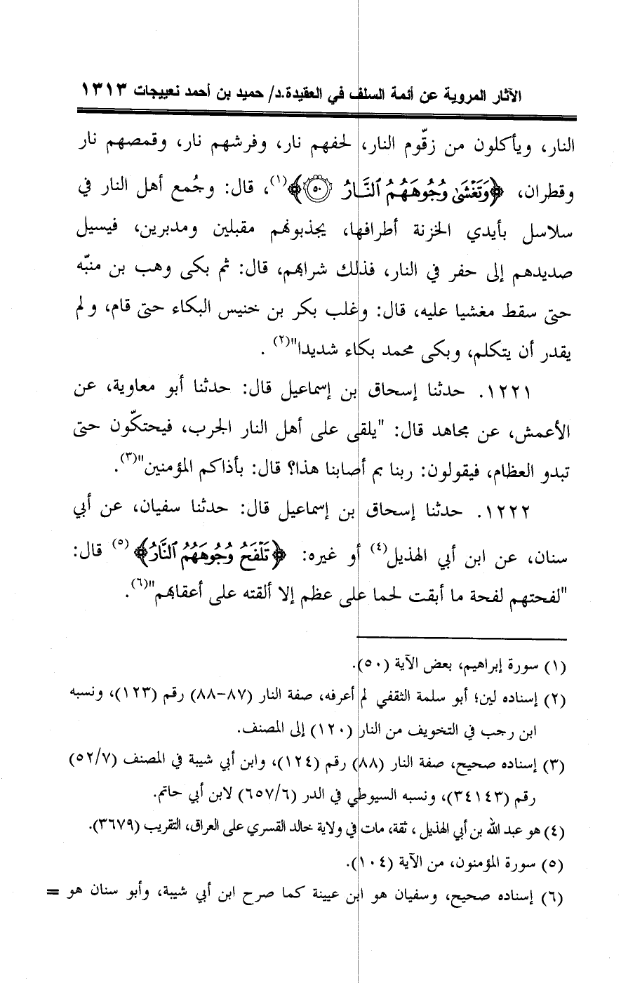 ١٢٢٢ - حدثنا إسحاق بن إسماعيل قال: حدثنا سفيان، عن أبي سنان، عن ابن أبي الهذيل (¬٤) أو غيره: {تَلْفَحُ وُجُوهَهُمُ النَّارُ} (¬٥) قال: "لفحتهم لفحة ما أبقت لحما علي عظم إلا ألقته على أعقابهم" (¬٦).