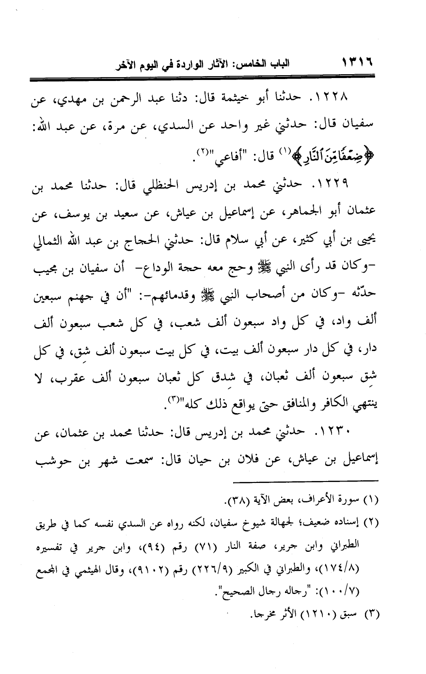 ١٢٢٨ - حدثنا أبو خيثمة قال: دثنا عبد الرحمن بن مهدي، عن سفيان قال: حدثني غير واحد عن السدي، عن مرة، عن عبد اللَّه: {ضِعْفًا مِنَ النَّارِ} (¬١) قال: "أفاعى" (¬٢).