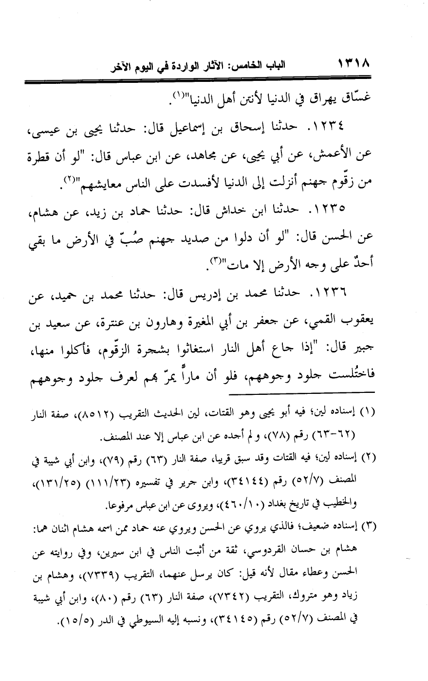 ١٢٣٦ - حدثنا محمد بن إدريس قال: حدثنا محمد بن حميد، عن يعقوب القمي، عن جعفر بن أبي المغيرة وهارون بن عنترة، عن سعيد بن جبير قال: "إذا جاع أهل النار استغاثوا بشجرة الزقّوم، فأكلوا منها، فاختُلست جلود وجوههم، فلو أن مارًّا يمرّ بهم لعرف جلود وجوههم