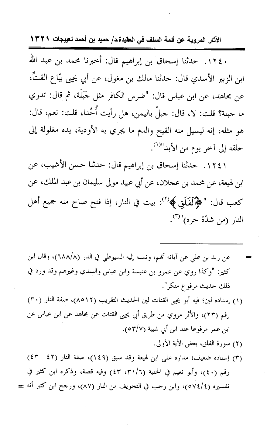 ١٢٤١ - حدثنا إسحاق بن إبراهيم قال: حدثنا حسن الأشيب، عن ابن لهيعة، عن محمد بن عجلان، عن أبي عبيد مولى سليمان بن عبد الملك، عن كعب قال: " {الْفَلَقِ} (¬٢): بيت في النار، إذا فتح صاح منه جميع أهل النار (من شدّة حره) " (¬٣).