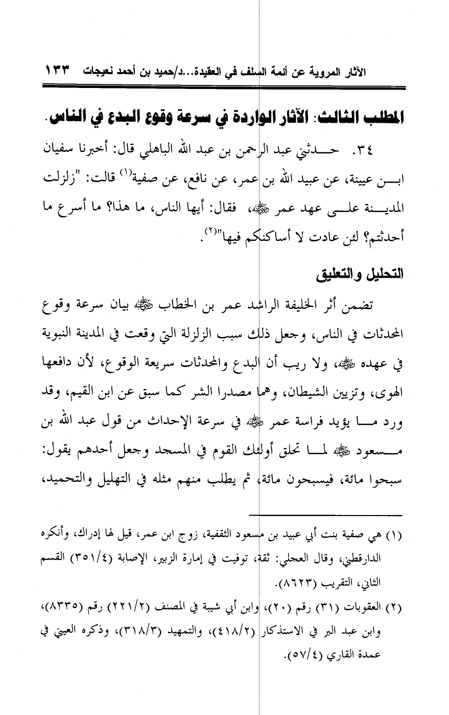 ٣٤ - حدثني عبد الرحمن بن عبد اللَّه الباهلي قال: أخبرنا سفيان ابن عيينة، عن عبيد اللَّه بن عمر، عن نافع، عن صفية (¬١) قالت: "زلزلت المدينة على عهد عمر -رضي اللَّه عنه-، فقال: أيها الناس، ما هذا؟ ما أسرع ما أحدثتم؟ لئن عادت لا أساكنكم فيها" (¬٢).