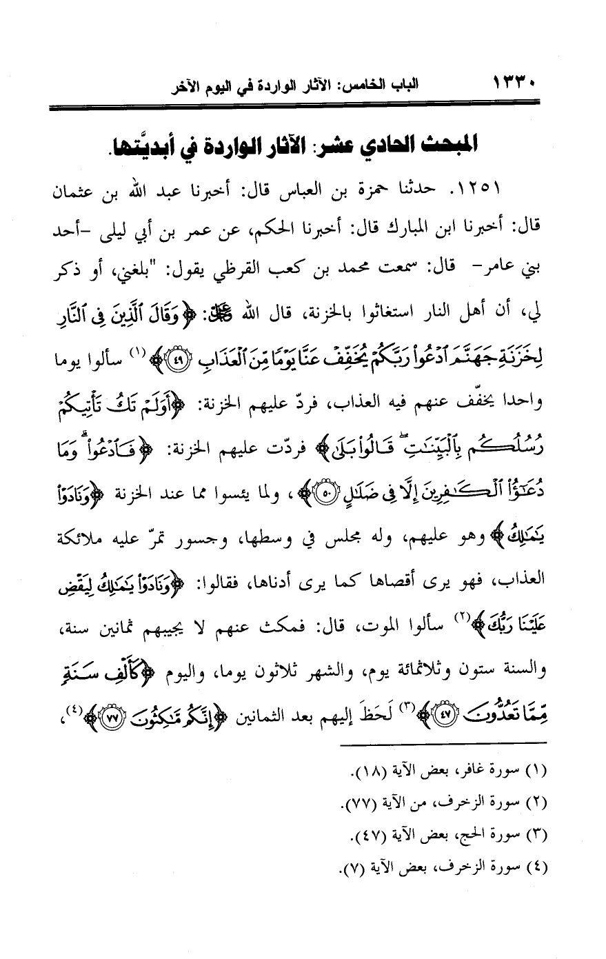 ١٢٥١ - حدثنا حمزة بن العباس قال: أخبرنا عبد اللَّه بن عثمان قال: أخبرنا ابن المبارك قال: أخبرنا الحكم، عن عمر بن أبي ليلى -أحد بني عامر- قال: سمعت محمد بن كعب القرظي يقول: "بلغني، أو ذكر لي، أن أهل النار استغاثوا بالخزنة، قال اللَّه -عَزَّ وَجَلَّ-: {وَقَالَ الَّذِينَ فِي النَّارِ لِخَزَنَةِ جَهَنَّمَ ادْعُوا رَبَّكُمْ يُخَفِّفْ عَنَّا يَوْمًا مِنَ الْعَذَابِ (٤٩)} (¬١) سألوا يوما واحدا يخفّف عنهم فيه العذاب، فردّ عليهم الخزنة: {أَوَلَمْ تَكُ تَأْتِيكُمْ رُسُلُكُمْ بِالْبَيِّنَاتِ قَالُوا بَلَى} فردّت عليهم الخزنة: {فَادْعُوا وَمَا دُعَاءُ الْكَافِرِينَ إِلَّا فِي ضَلَالٍ (٥٠)}، ولما يئسوا مما عند الخزنة {وَنَادَوْا يَامَالِكُ} وهو عليهم، وله مجلس في وسطها، وجسور تمرّ عليه ملائكة العذاب، فهو يرى أقصاها كما يرى أدناها، فقالوا: {وَنَادَوْا يَامَالِكُ لِيَقْضِ عَلَيْنَا رَبُّكَ} (¬٢) سألوا الموت، قال: فمكث عنهم لا يجيبهم ثمانين سنة، والسنة ستون وثلاثمائة يوم، والشهر ثلاثون يوما، واليوم {كَأَلْفِ سَنَةٍ مِمَّا تَعُدُّونَ (٤٧)} (¬٣) لَحَظَ إليهم بعد الثمانين {إِنَّكُمْ مَاكِثُونَ (٧٧)} (¬٤)،