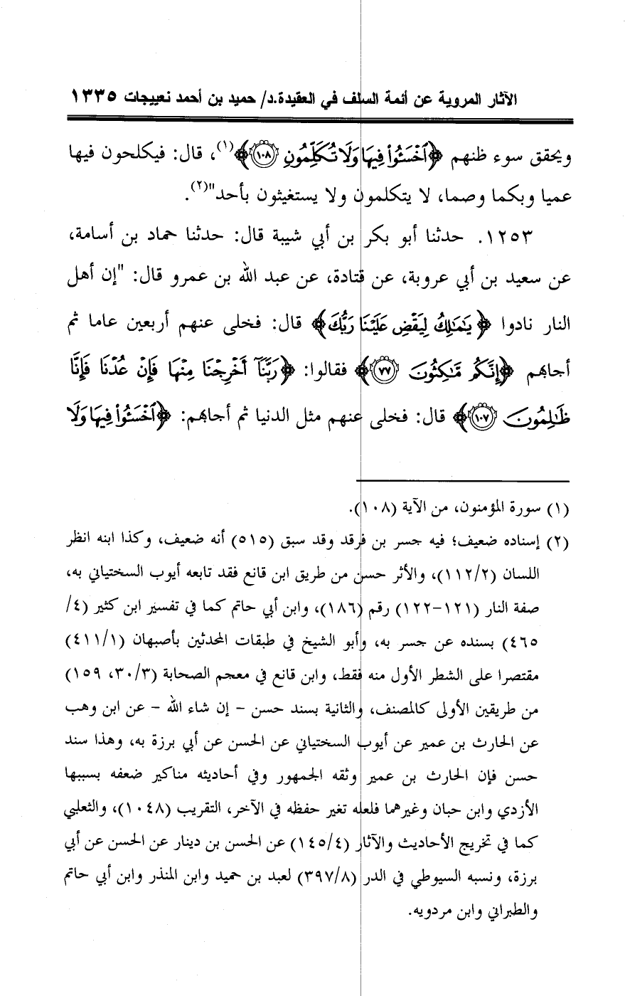 ١٢٥٣ - حدثنا أبو بكر بن أبي شيبة قال: حدثنا حماد بن أسامة، عن سعيد بن أبي عروبة، عن قتادة، عن عبد اللَّه بن عمرو قال: "إن أهل النار نادوا {يَامَالِكُ لِيَقْضِ عَلَيْنَا رَبُّكَ} قال: فخلى عنهم أربعين عاما ثم أجابهم {إِنَّكُمْ مَاكِثُونَ (٧٧)} فقالوا: {رَبَّنَا أَخْرِجْنَا مِنْهَا فَإِنْ عُدْنَا فَإِنَّا ظَالِمُونَ (١٠٧)} قال: فخلى عنهم مثل الدنيا ثم أجابهم: {اخْسَئُوا فِيهَا وَلَا