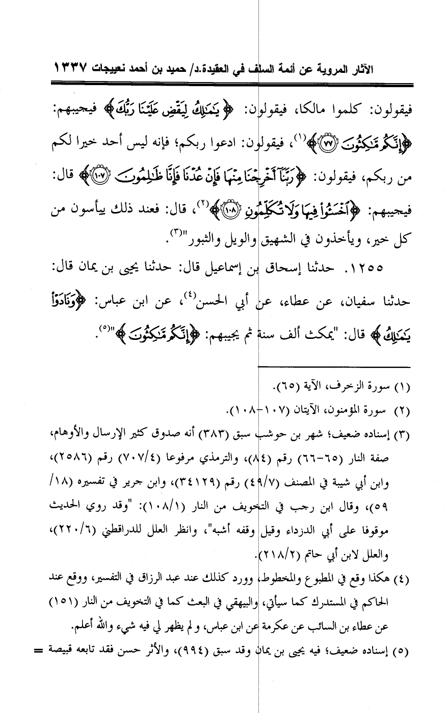 ١٢٥٥ - حدثنا إسحاق بن إسماعيل قال: حدثنا يحيى بن يمان قال: حدثنا سفيان، عن عطاء، عن أبي الحسن (¬٤)، عن ابن عباس: {وَنَادَوْا يَامَالِكُ} قال: "يمكث ألف سنة ثم يجيبهم: {إِنَّكُمْ مَاكِثُونَ} " (¬٥).