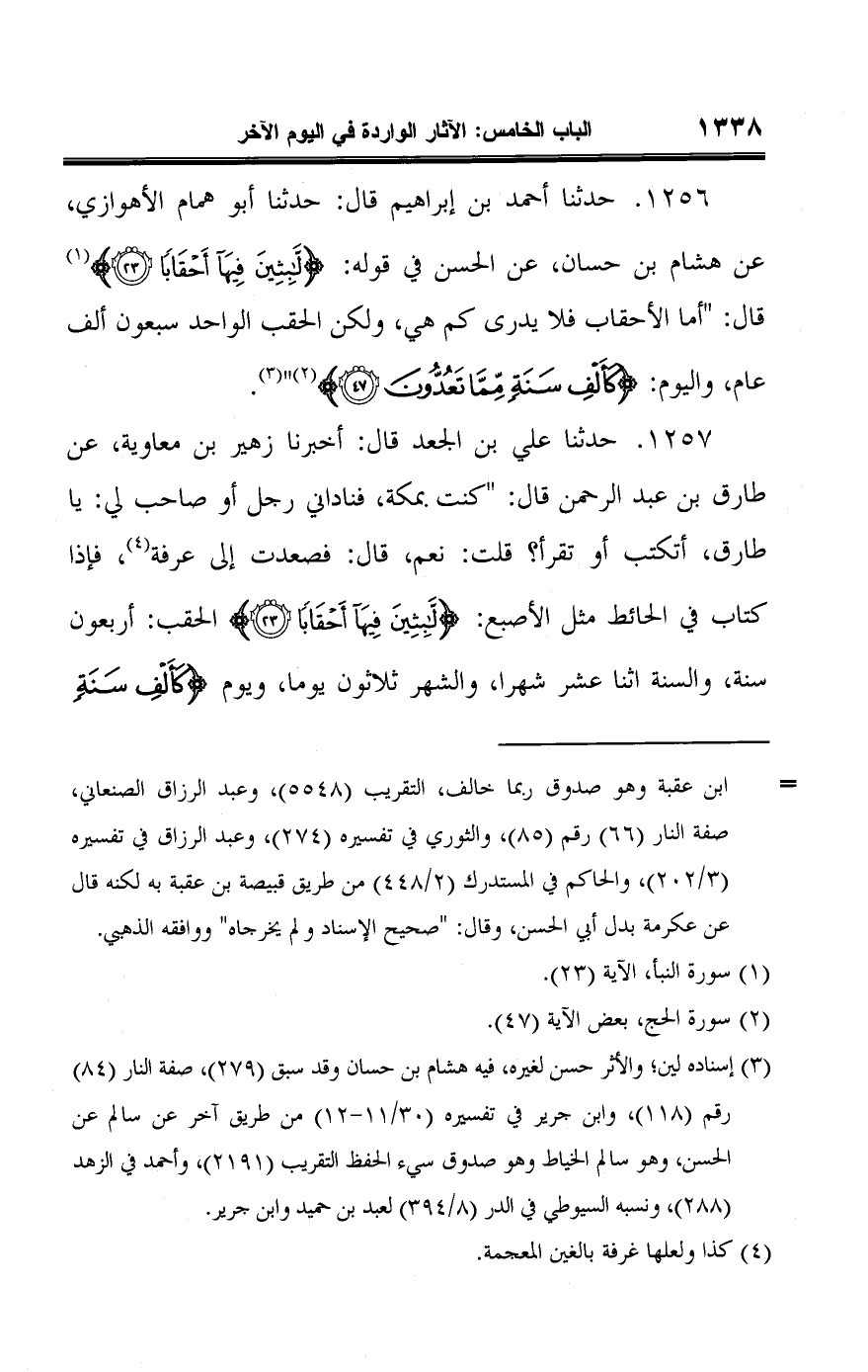 ١٢٥٦ - حدثنا أحمد بن إبراهيم قال: حدثنا أبو همام الأهوازي، عن هشام بن حسان، عن الحسن في قوله: {لَابِثِينَ فِيهَا أَحْقَابًا (٢٣)} (¬١) قال: "أما الأحقاب فلا يدرى كم هي، ولكن الحقب الواحد سبعون ألف عام، واليوم: {كَأَلْفِ سَنَةٍ مِمَّا تَعُدُّونَ (٤٧)} (¬٢) " (¬٣).