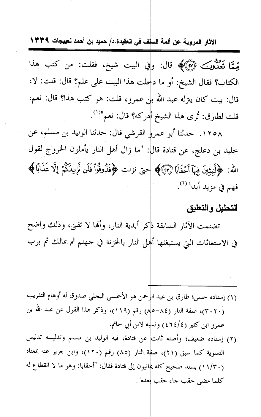 (¬٢) إسناده ضعيف؛ وأصله ثابت عن قتادة، فيه الوليد بن مسلم وتدليسه تدليس التسوية كما سبق (٢١)، صفة النار (٨٥) رقم (١٢٠)، وابن جرير عنه بمعناه (٣٠/ ١١) بسند صحيح كله يمانيون إلى قتادة فقال: "أحقابا: وهو ما لا انقطاع له كلما مضى حقب جاء حقب بعده".