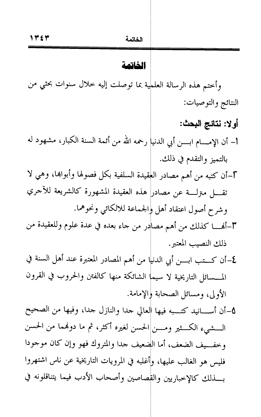 ٤ - أن كتب ابن أبي الدنيا من أهم المصادر المعتبرة عند أهل السنة في المسائل التاريخية لا سيما الشائكة منها كالفتن والحروب في القرون الأولى، ومسائل الصحابة في الإمامة.