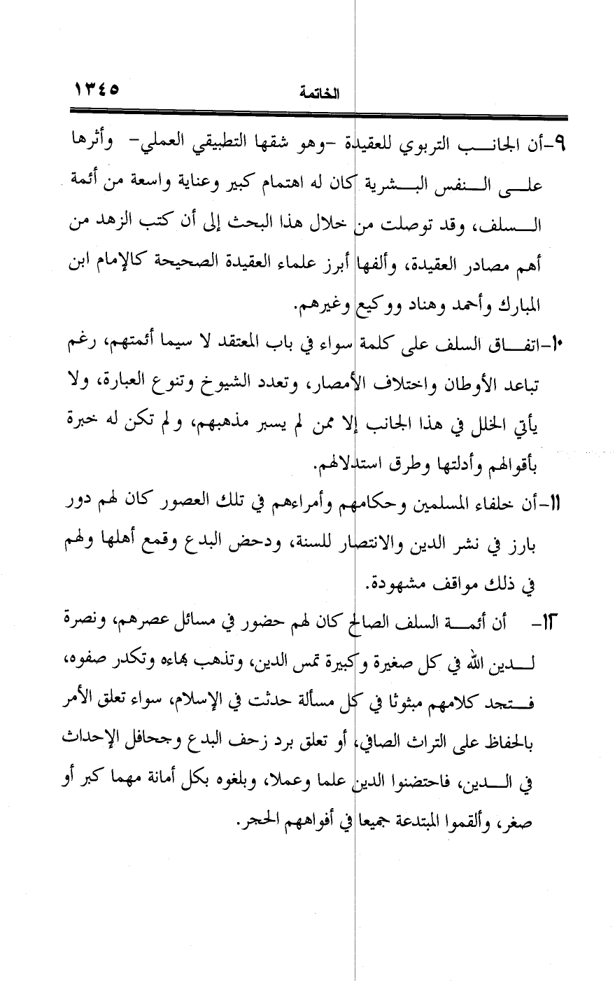 ١٢ - أن أئمة السلف الصالح كان لهم حضور في مسائل عصرهم، ونصرة لدين اللَّه في كل صغيرة وكبيرة تمس الدين، وتذهب بهاءه وتكدر صفوه، فتجد كلامهم مبثوثا في كل مسألة حدثت في الإسلام، سواء تعلق الأمر بالحفاظ على التراث الصافي، أو تعلق برد زحف البدع وجحافل الإحداث في الدين، فاحتضنوا الدين علما وعملا، وبلغوه بكل أمانة مهما كبر أو صغر، وألقموا المبتدعة جميعا في أفواههم الحجر.