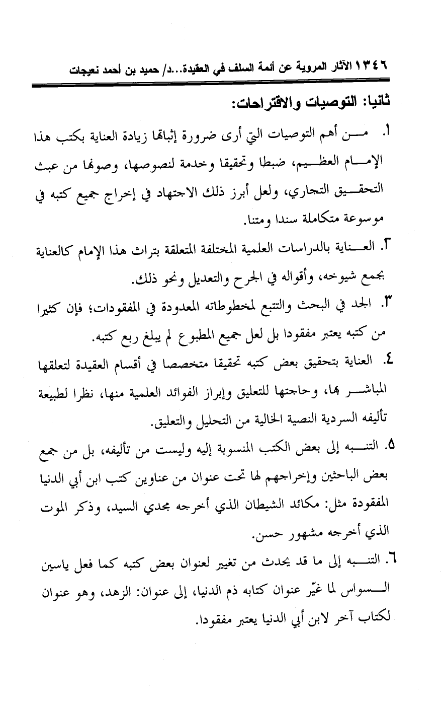 ١ - من أهم التوصيات التي أرى ضرورة إثباتها زيادة العناية بكتب هذا الإمام العظيم، ضبطا وتحقيقا وخدمة لنصوصها، وصونها من عبث التحقيق التجاري، ولعل أبرز ذلك الاجتهاد في إخراج جميع كتبه في موسوعة متكاملة سندا ومتنا.