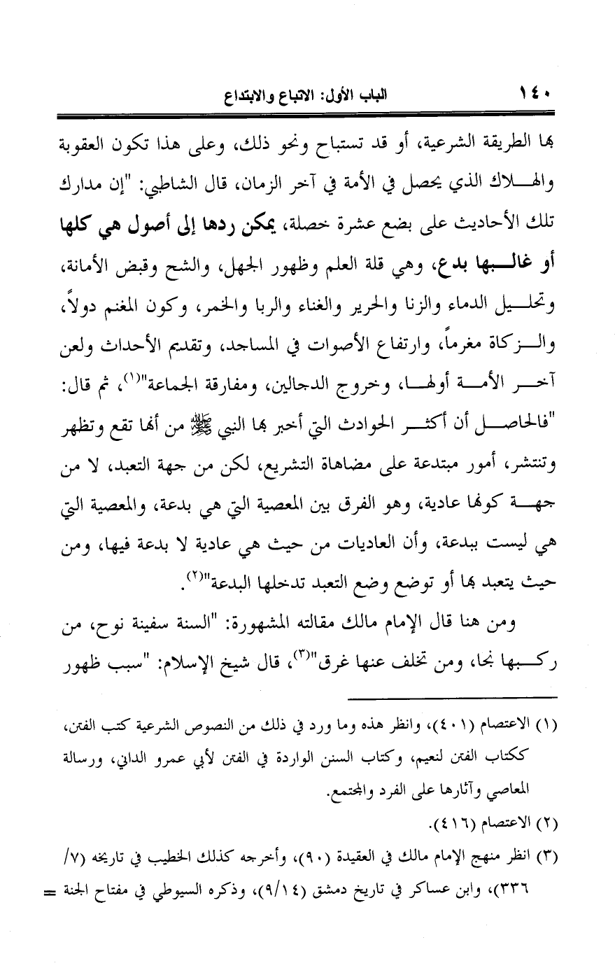 ومن هنا قال الإمام مالك مقالته المشهورة: "السنة سفينة نوح، من ركبها نجا، ومن تخلف عنها غرق" (¬٣)، قال شيخ الإسلام: "سبب ظهور