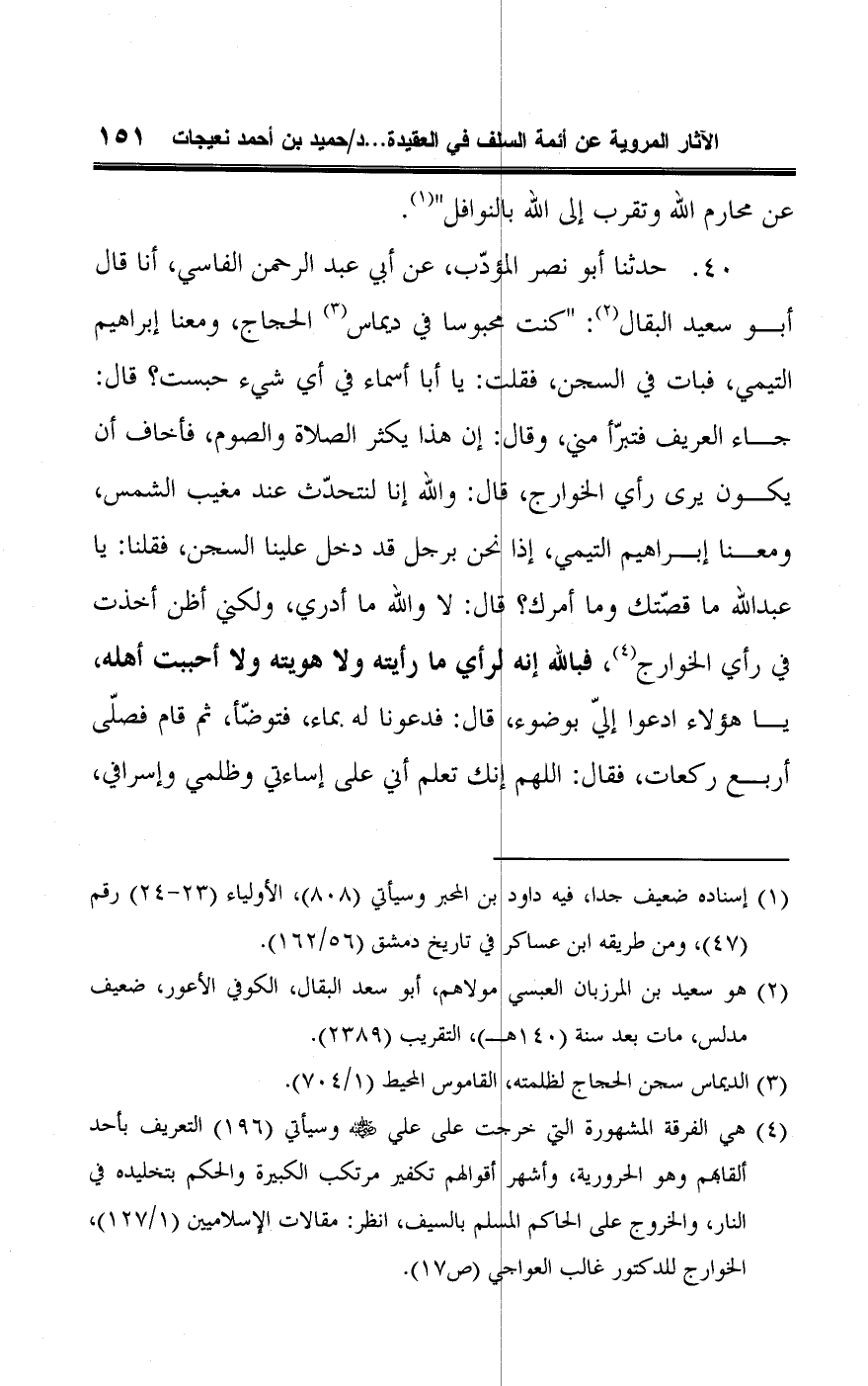 ٤٠ - حدثنا أبو نصر المؤدّب، عن أبي عبد الرحمن الفاسي، أنا قال أبو سعيد البقال (¬٢): "كنت محبوسا في ديماس (¬٣) الحجاج، ومعنا إبراهيم التيمي، فبات في السجن، فقلت: يا أبا أسماء في أي شيء حبست؟ قال: جاء العريف فتبرّأ مني، وقال: إن هذا يكثر الصلاة والصوم، فأخاف أن يكون يرى رأي الخوارج، قال: واللَّه إنا لنتحدّث عند مغيب الشمس، ومعنا إبراهيم التيمي, إذا نحن برجل قد دخل علينا السجن، فقلنا: يا عبد اللَّه ما قصّتك وما أمرك؟ قال: لا واللَّه ما أدري، ولكني أظن أخذت في رأي الخوارج (¬٤)، فباللَّه إنه لرأي ما رأيته ولا هويته ولا أحببت أهله، يا هؤلاء ادعوا إليّ بوضوء، قال: فدعونا له بماء، فتوضّأ، ثم قام فصلّى أربع ركعات، فقال: اللهم إنك تعلم أني على إساءتي وظلمي وإسرافي،
