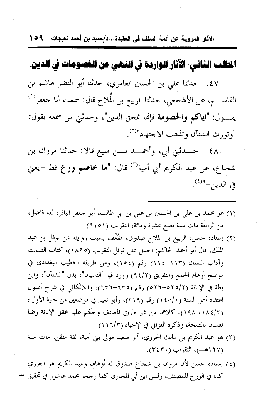 ٤٧ - حدثنا علي بن الحسين العامري، حدثنا أبو النضر هاشم بن القاسم، عن الأشجعي، حدثنا الربيع بن المُلاح قال: سمعت أبا جعفر (¬١) يقول: "إياكم والخصومة فإنها تمحق الدين"، وحدثني من سمعه يقول: "وتورث الشنآن وتذهب الاجتهاد" (¬٢).